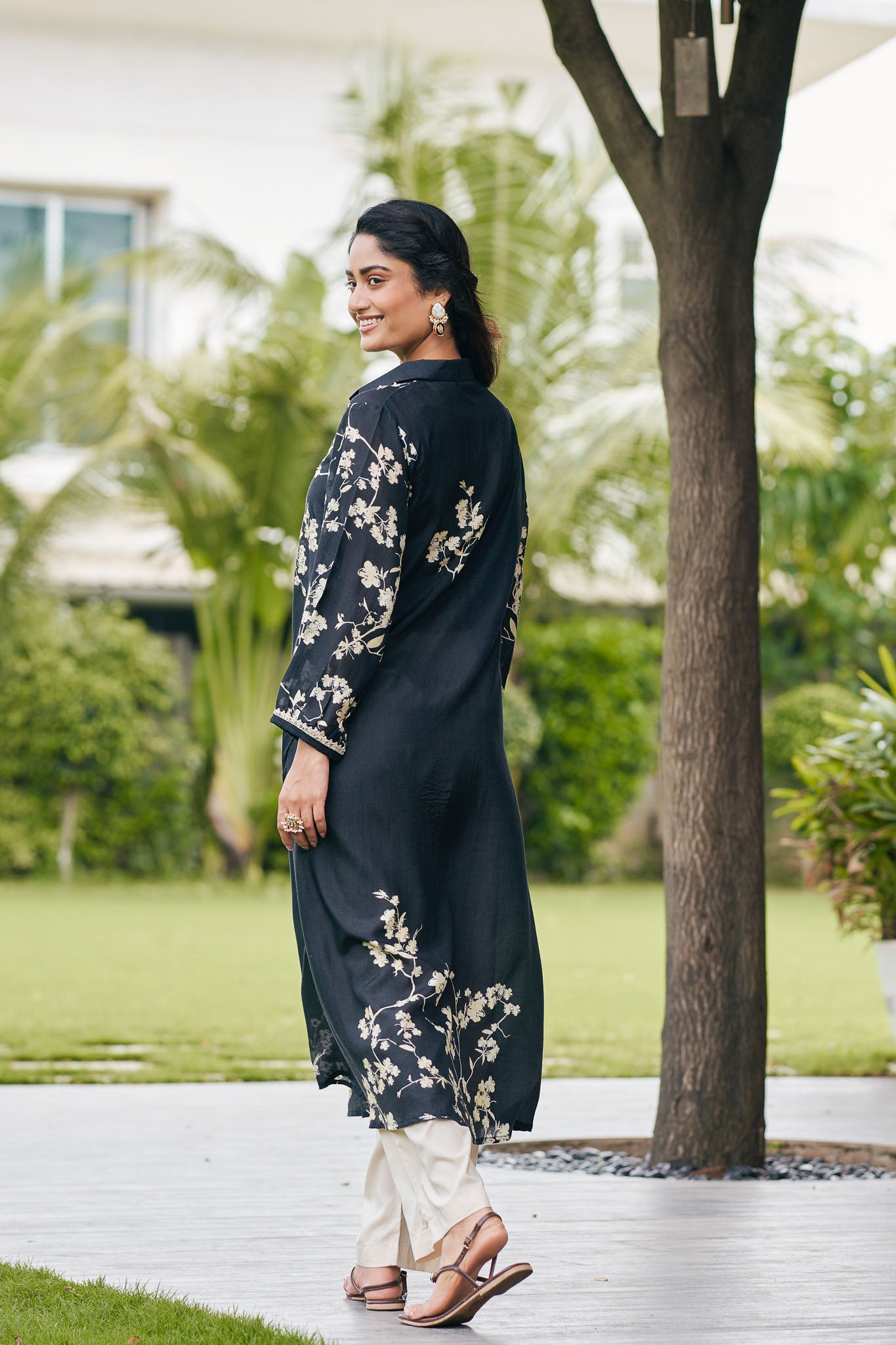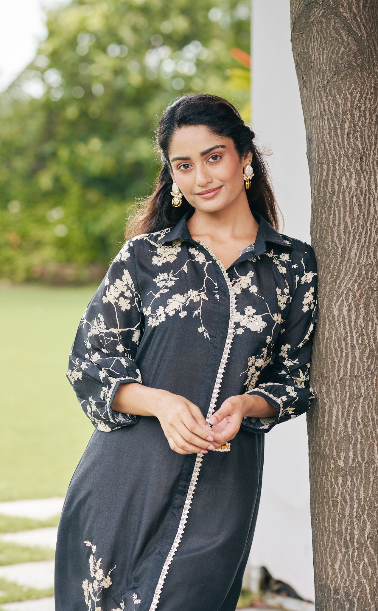 Black Shirt Kurta set with Floral Embroidery