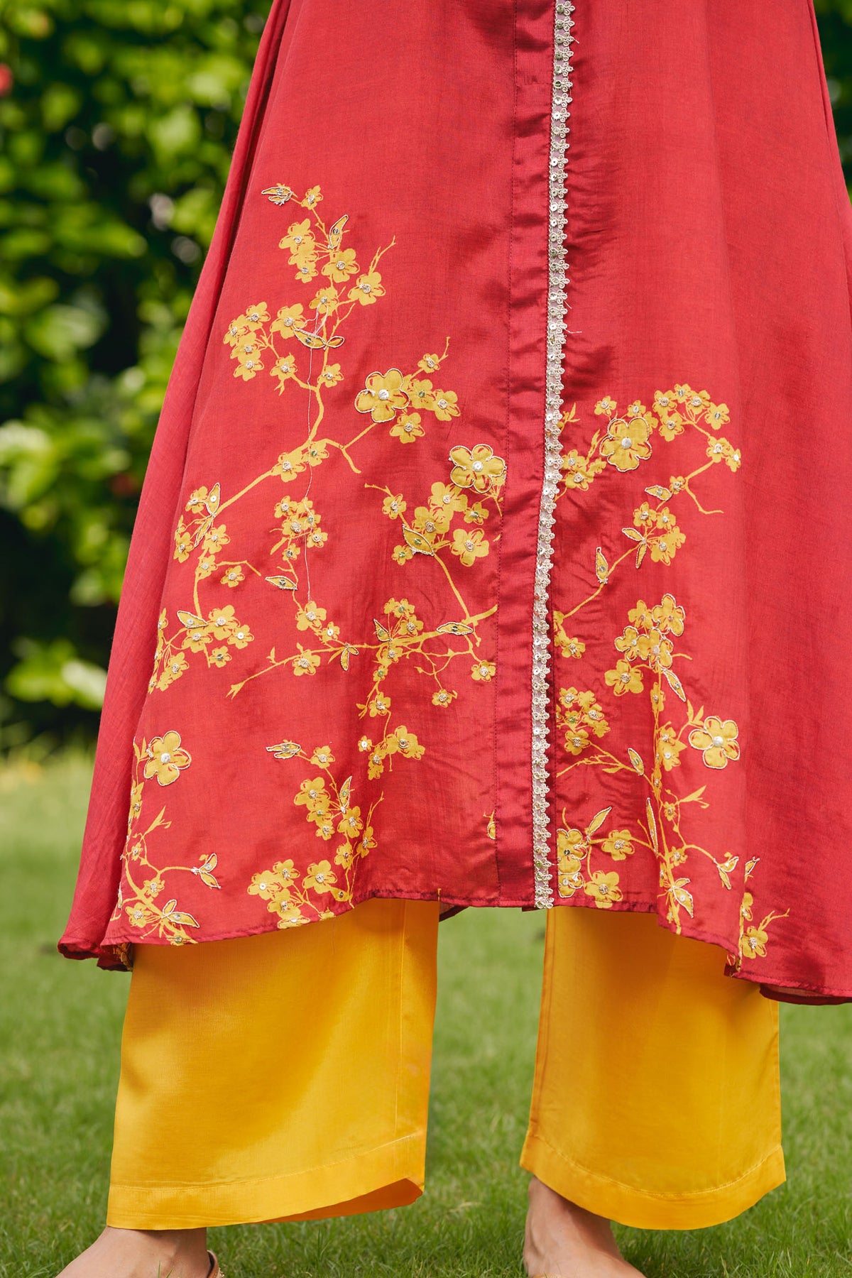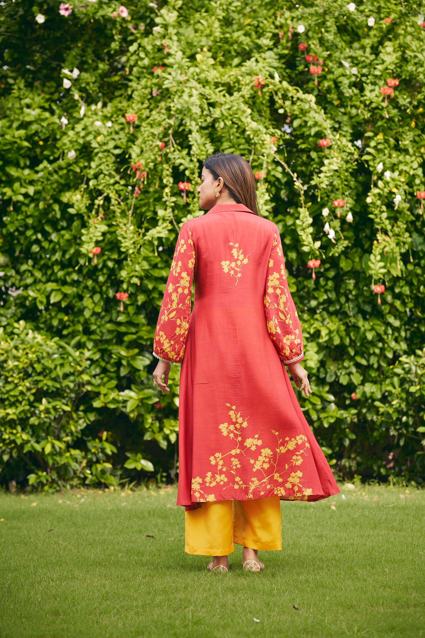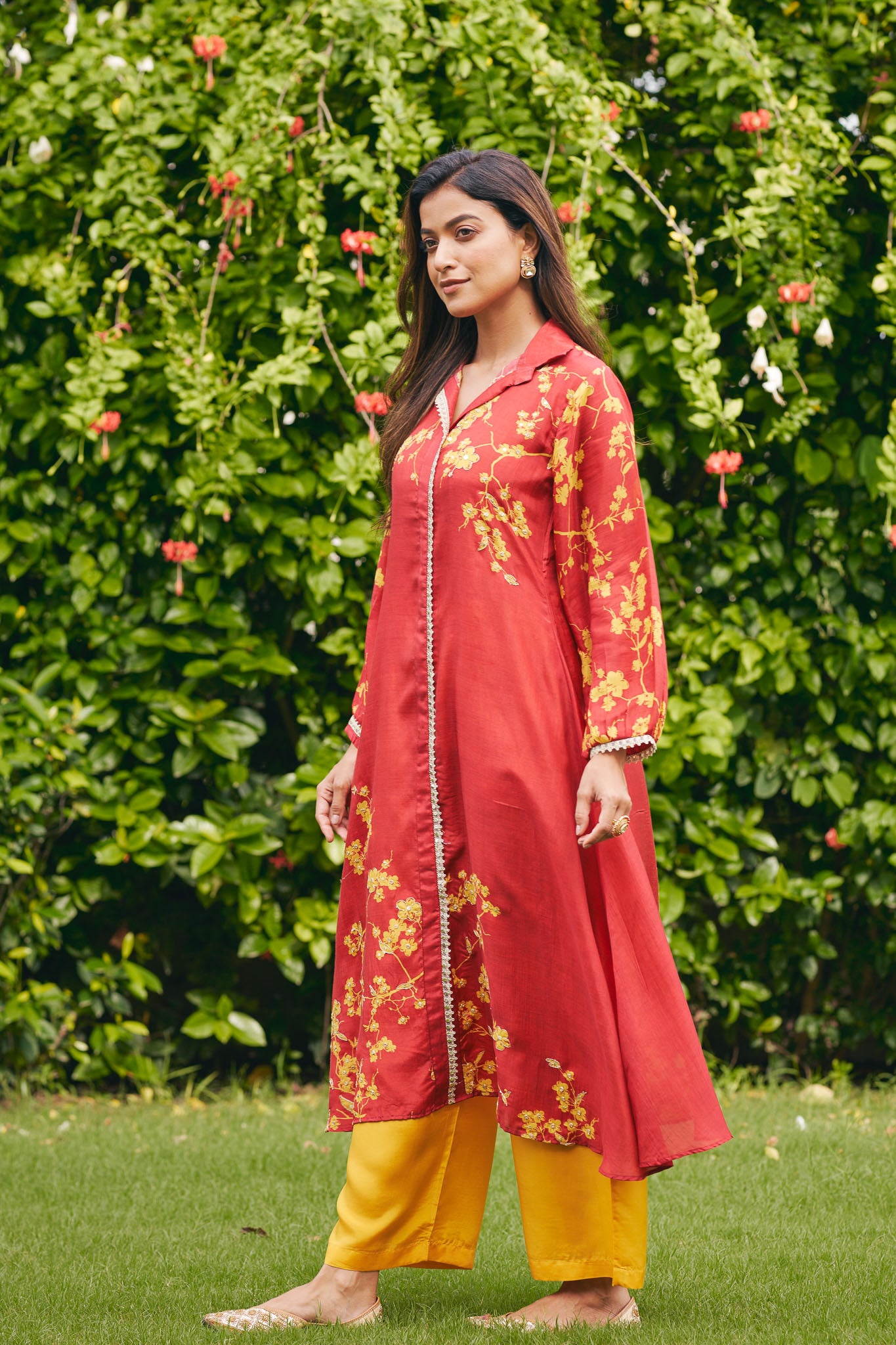 Floral Shirt Kurta Set With Inseam Pockets Long Puff Sleeves Emblissed With Lace, Dori And Sequience Paired With Solid Pants