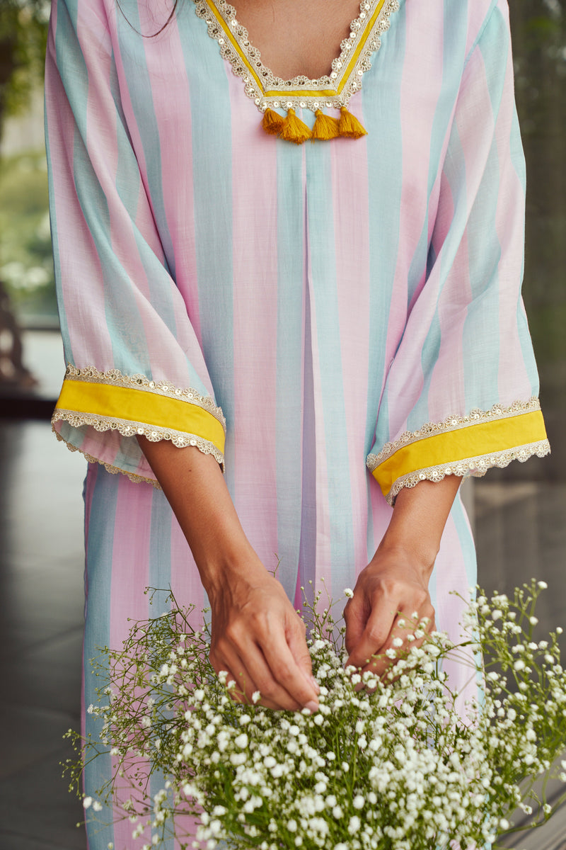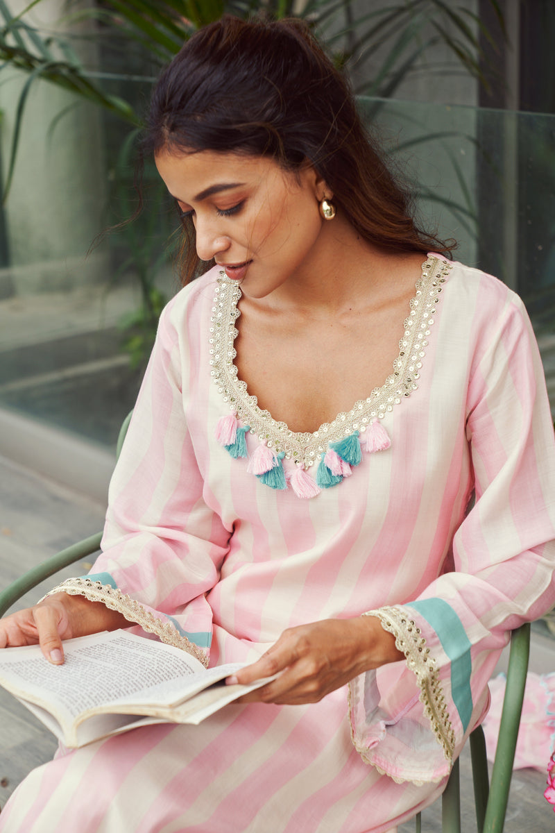Blush Pink Striped Kurta with Tassels
