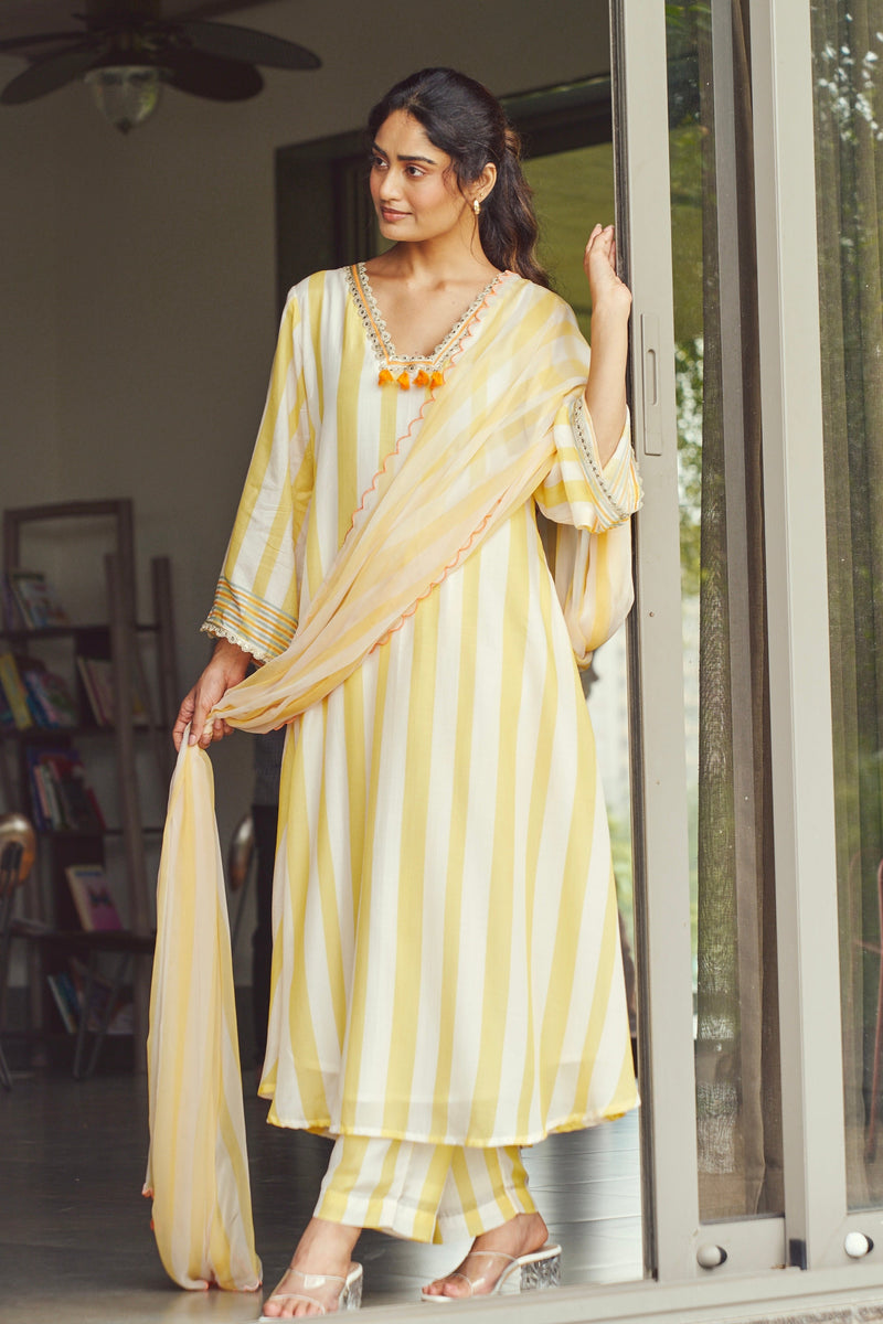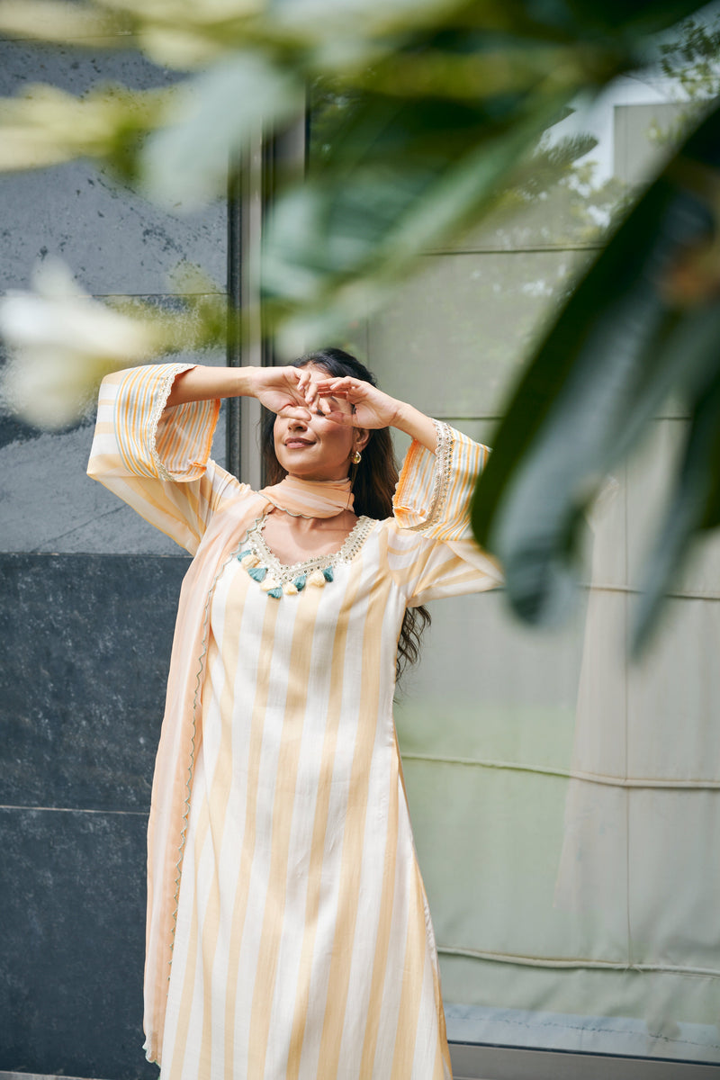 Yellow Striped Kurta with Orange Tassels