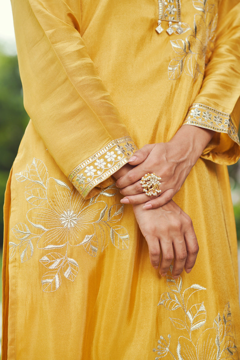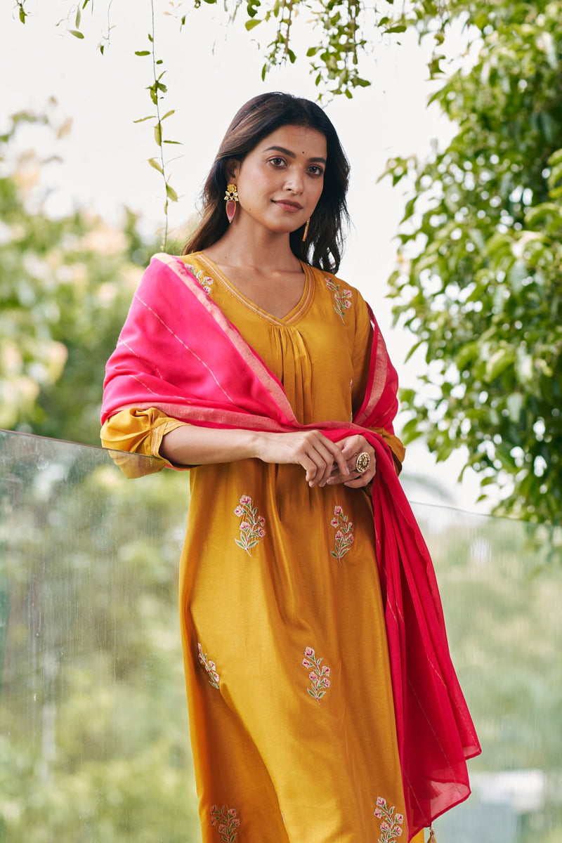 Mustard Embroidered Festive Kurta with Pink Dupatta
