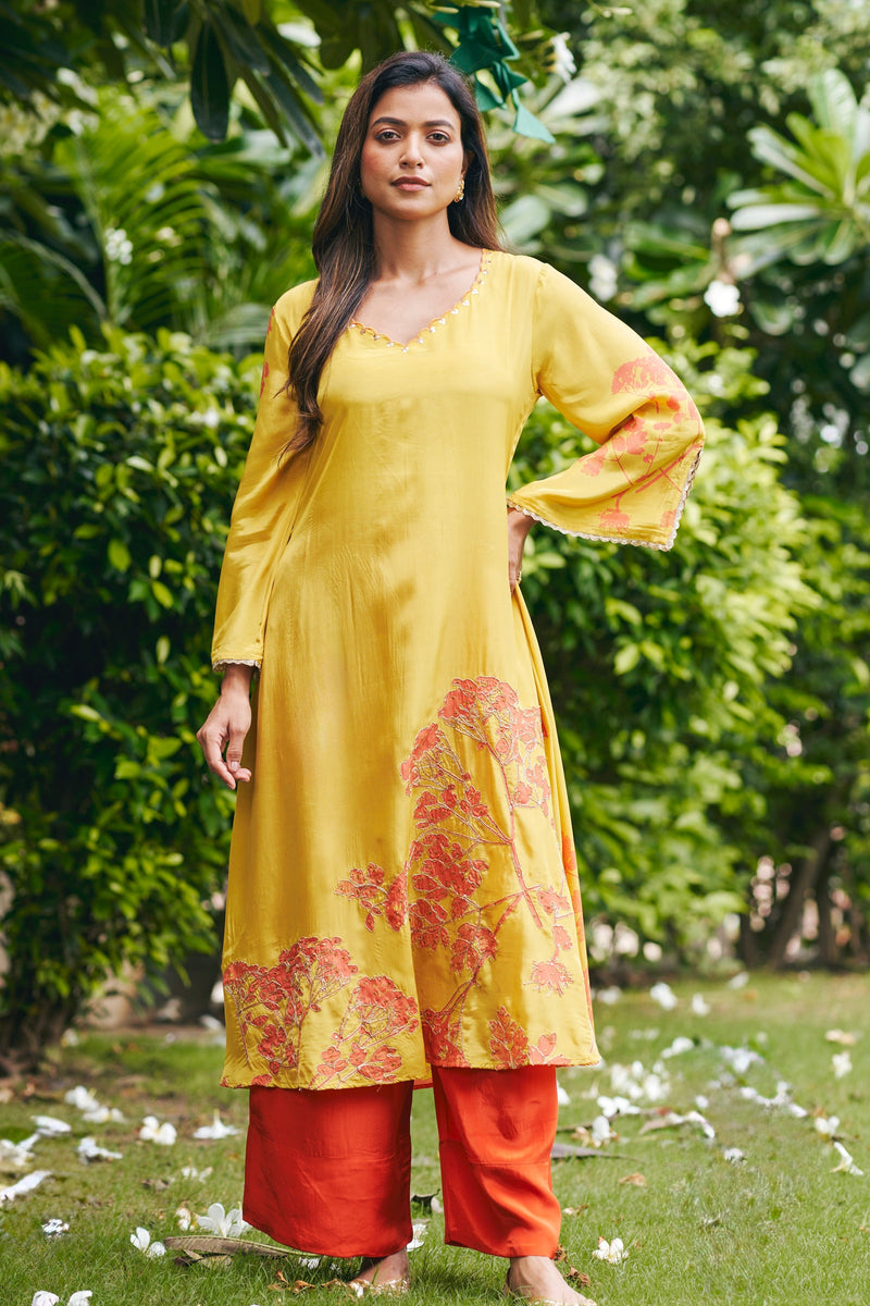 Rust and Yellow Floral Festive Kurta Set