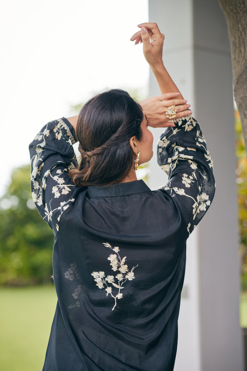 Black Shirt Kurta set with Floral Embroidery