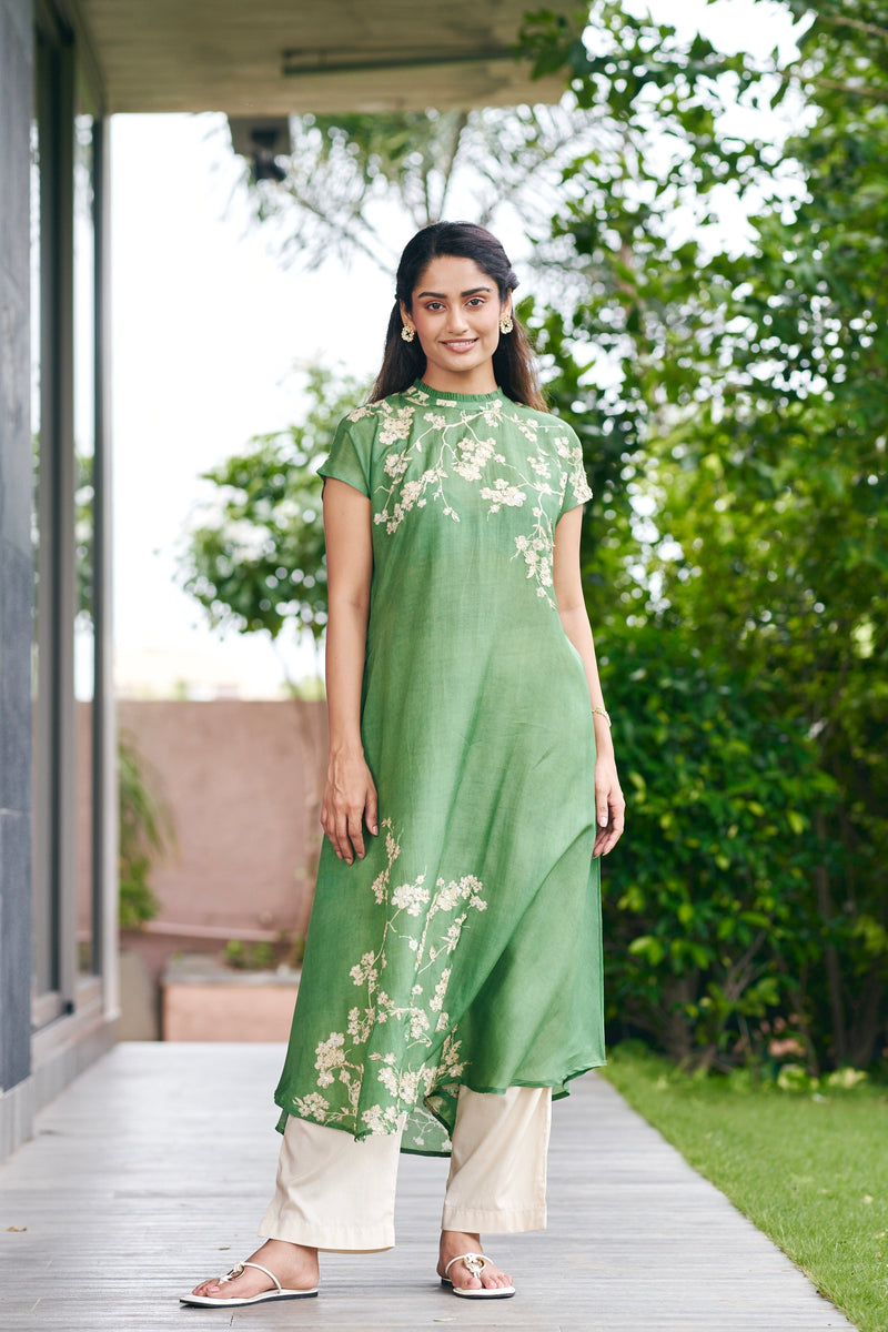 Green High Neck Floral Festive Kurta Set