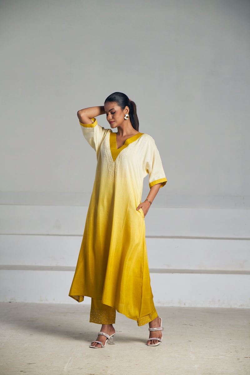Mustard Printed Viscose Muslin Embroidered Kurti with Palazzo