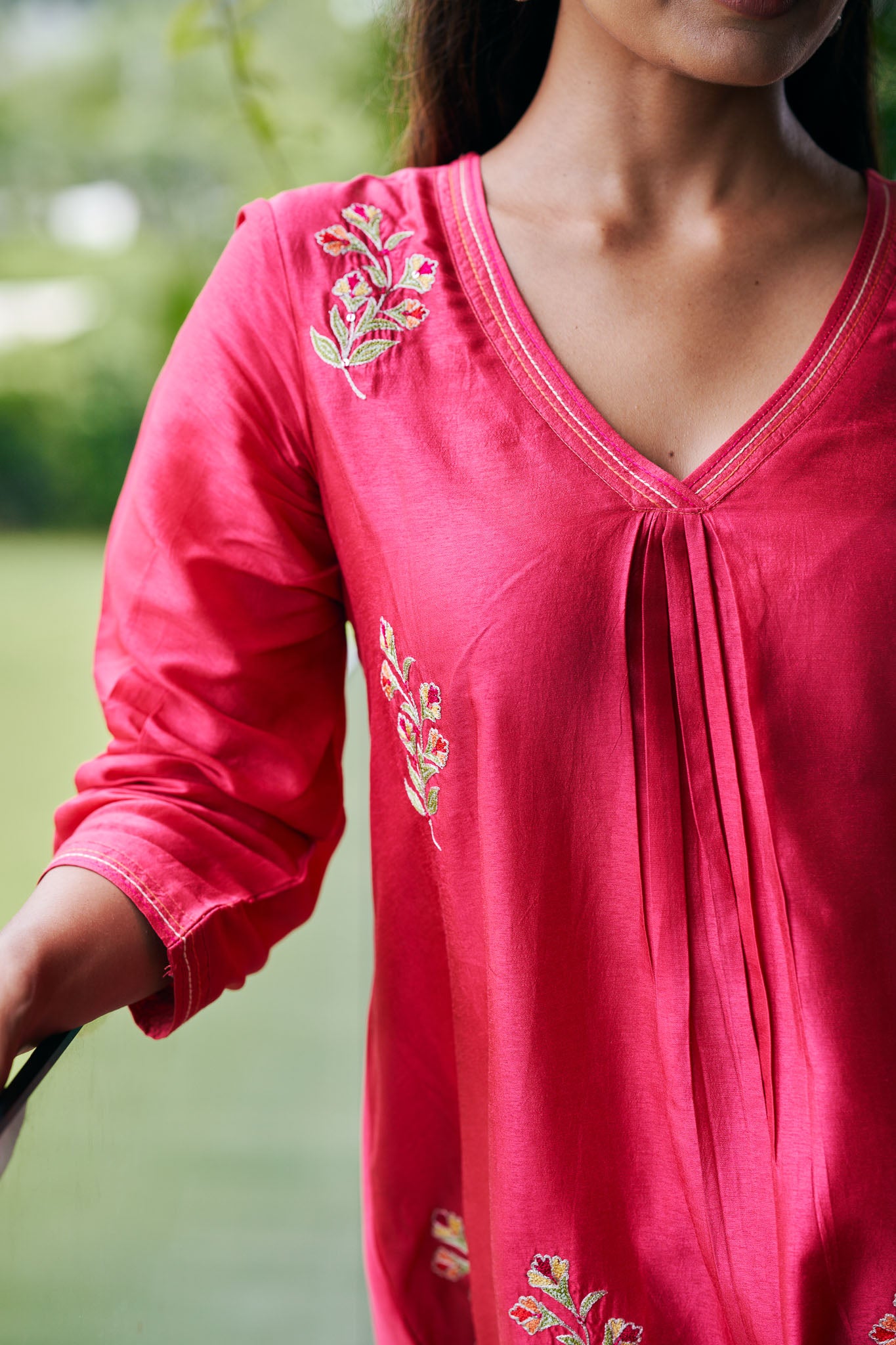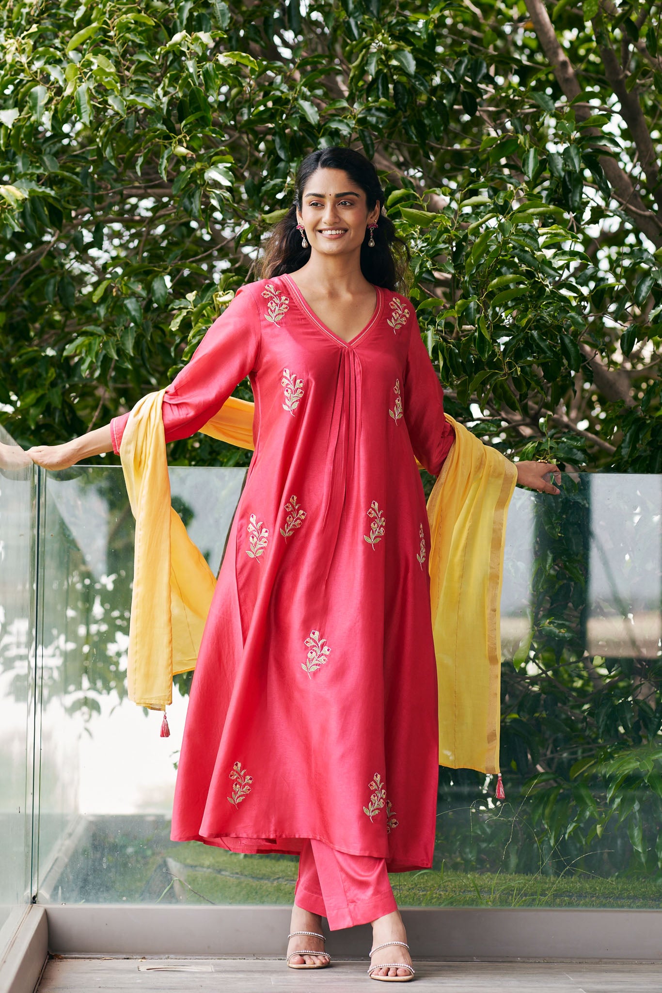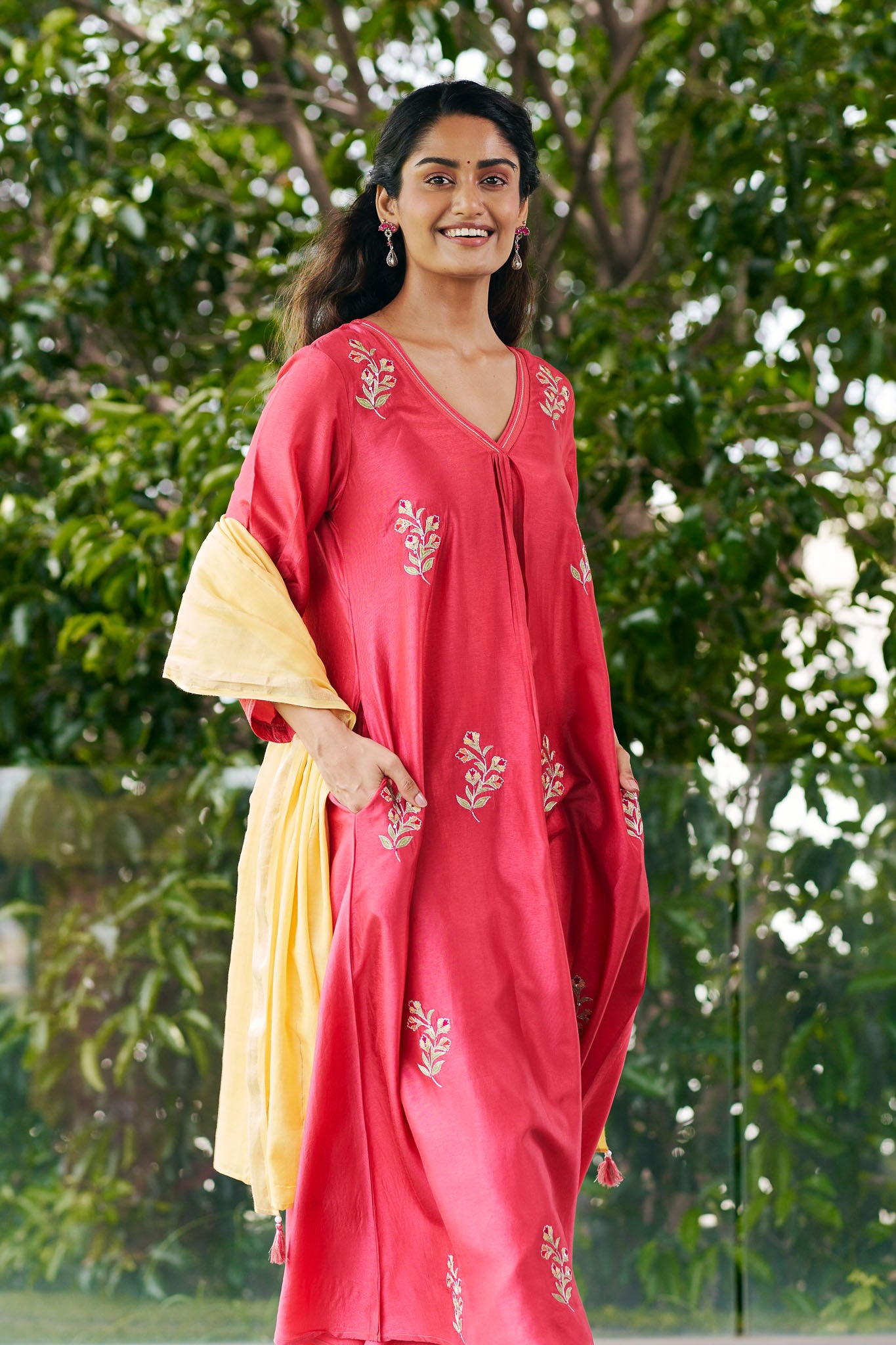 Rounded V Neck Aline Dress With Inseam Pockes Cuff Sleeves Emblissed With Embroidery And Kantha Stich Paired With Pants And Dyed Jacard Dupatta