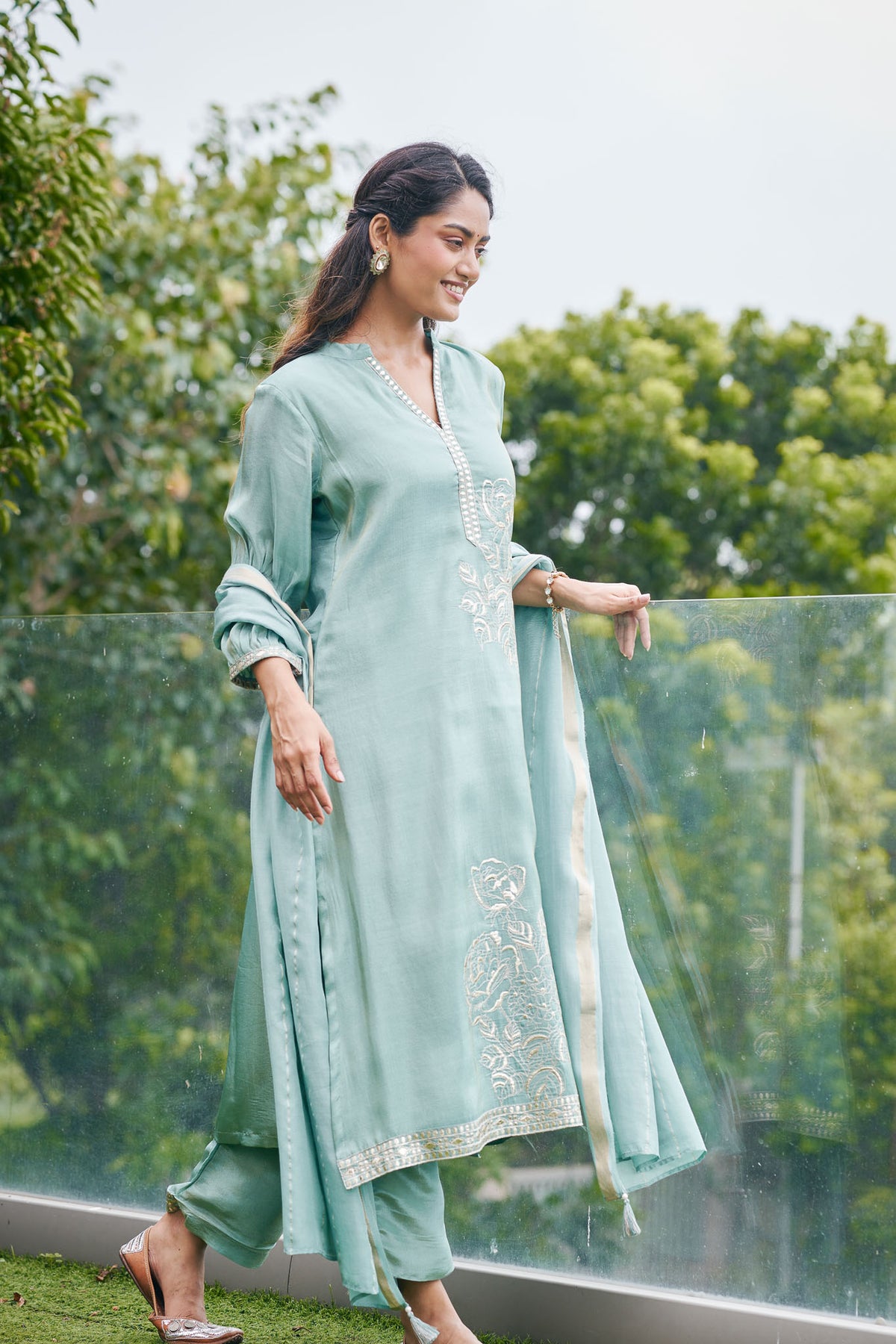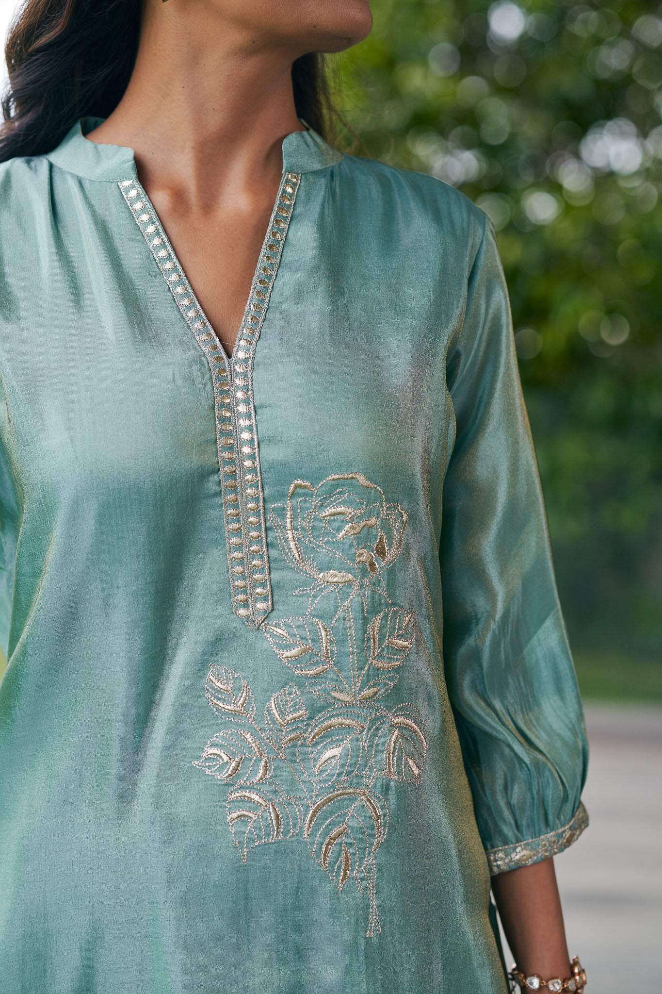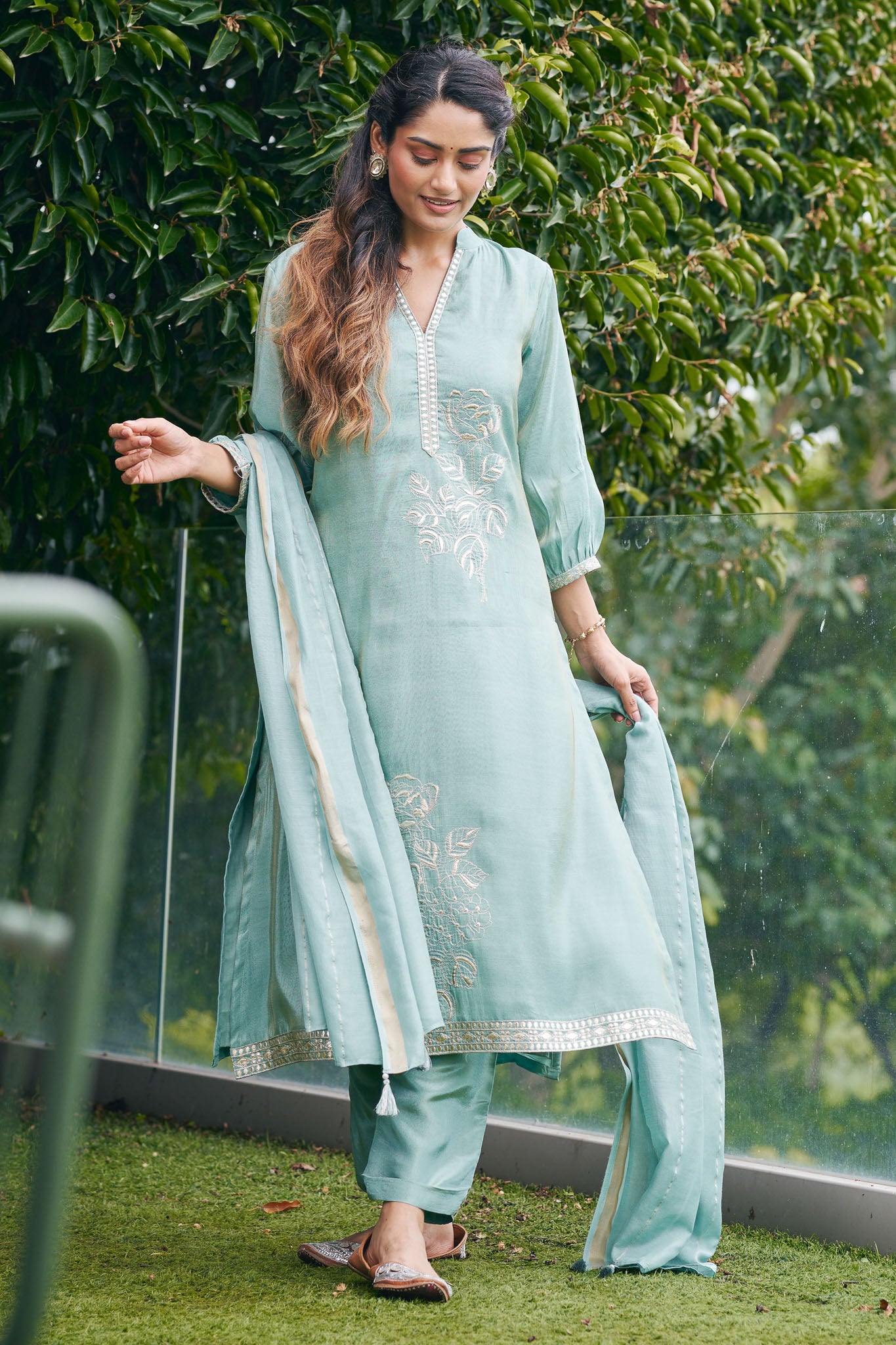 - V-neckline and Subtle Gota Detailing add Elegance to This Breezy Daywear Ensemble.