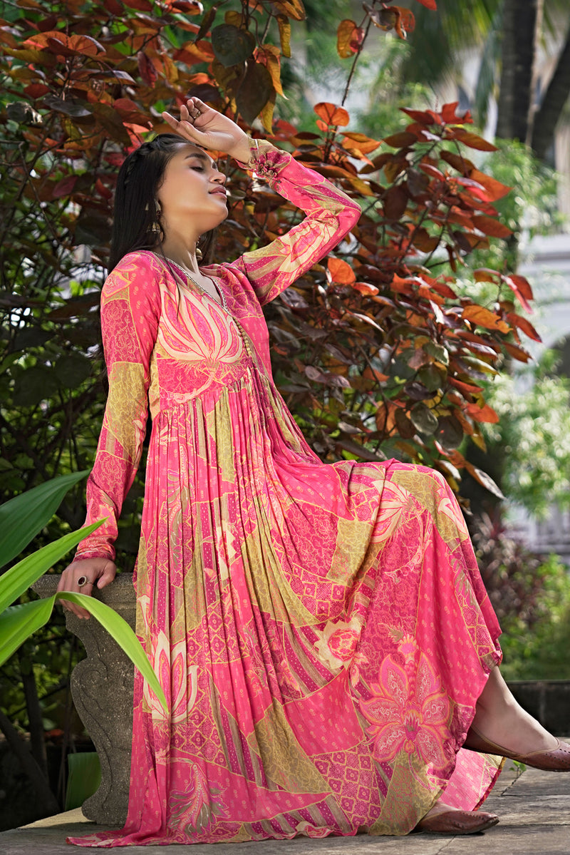 Lotus Pink Chinon Chiffon Kurta Set with Long Sleeves
