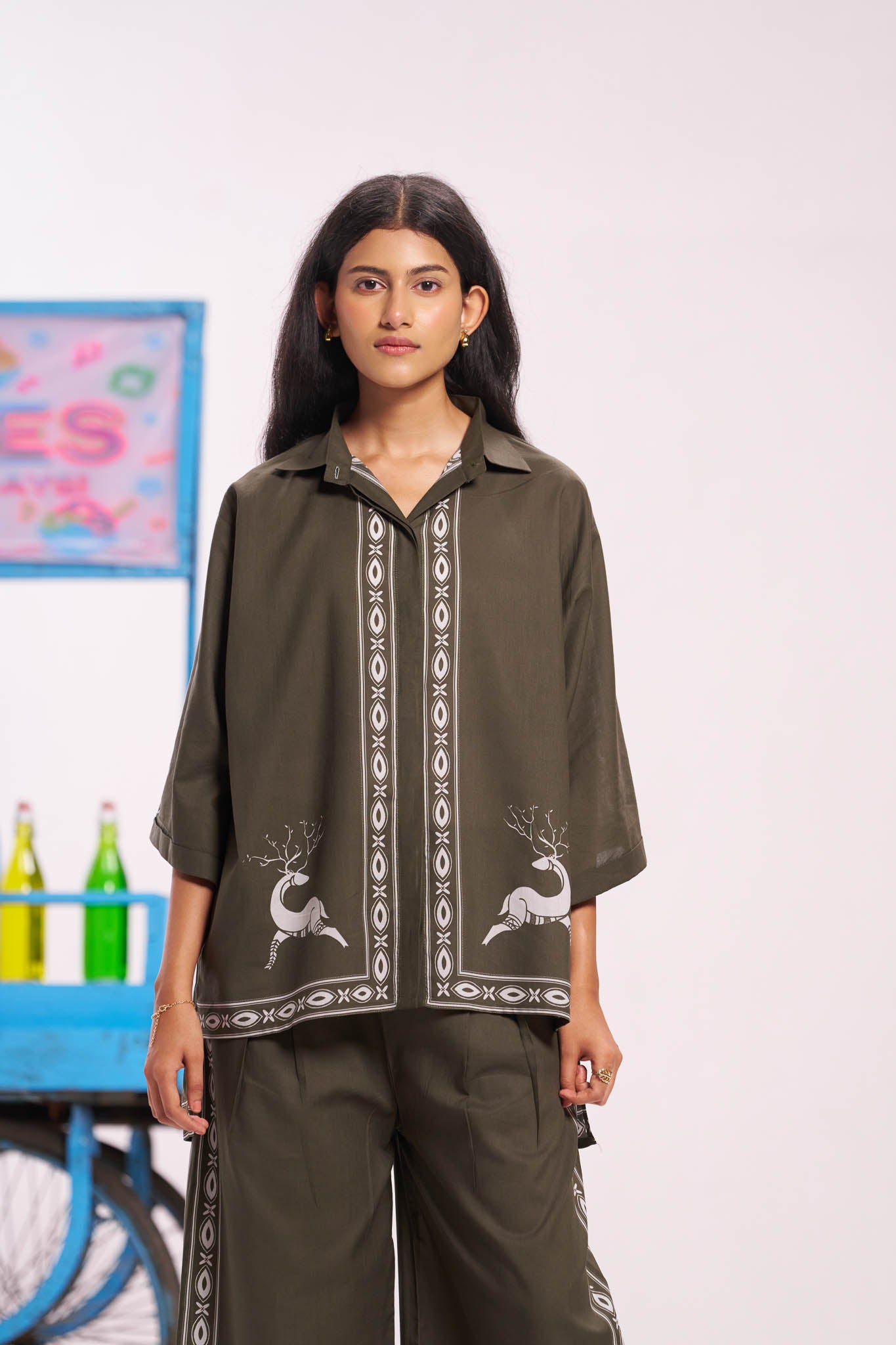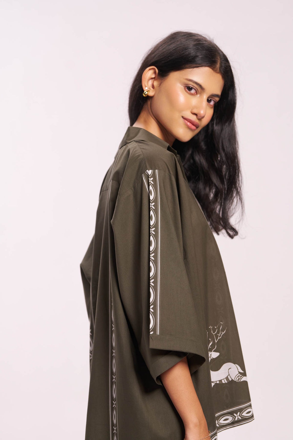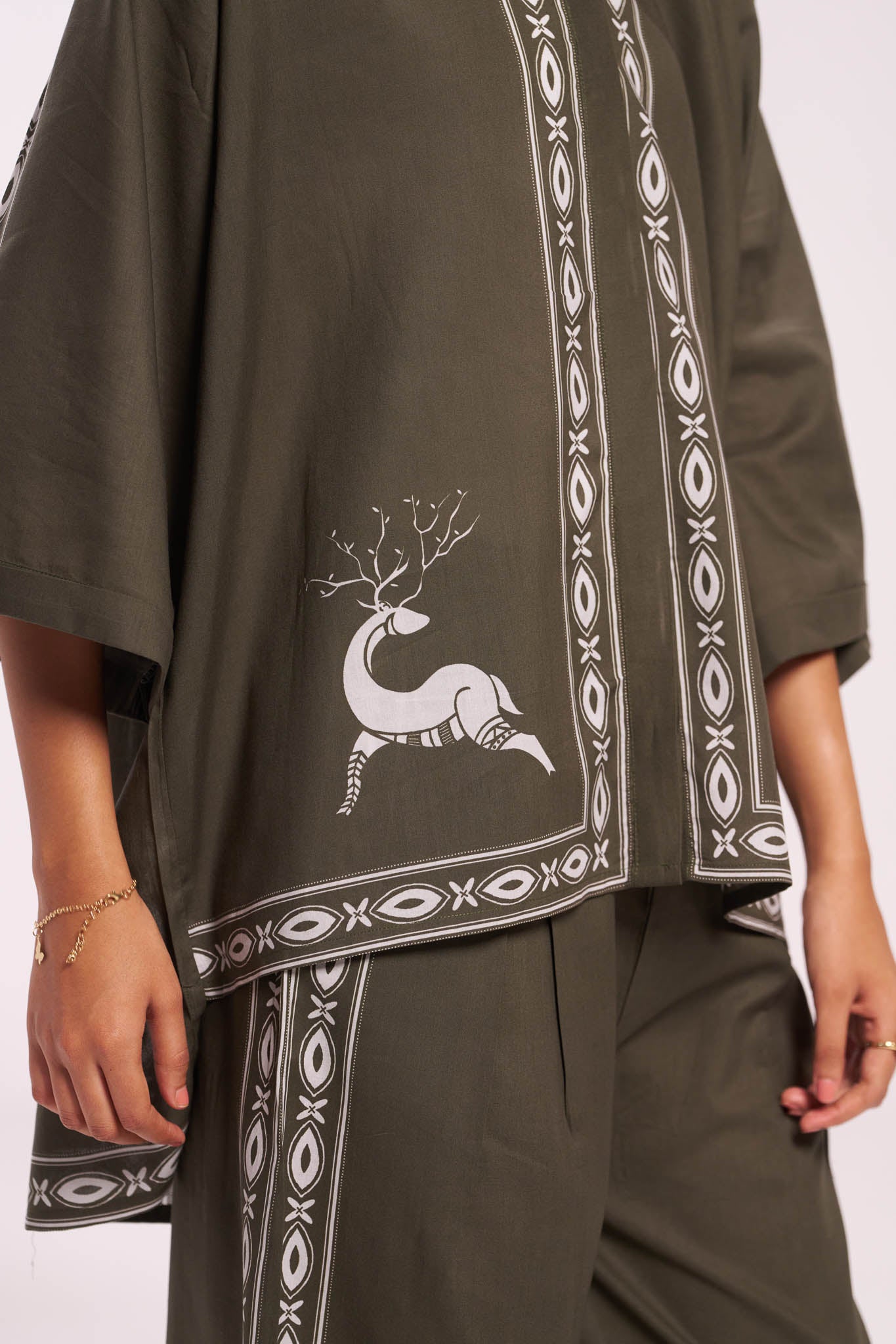 An earthy olive cotton shirt with tribal-inspired geometric borders and a charming deer motif on the front panels — a summer wardrobe must-have.