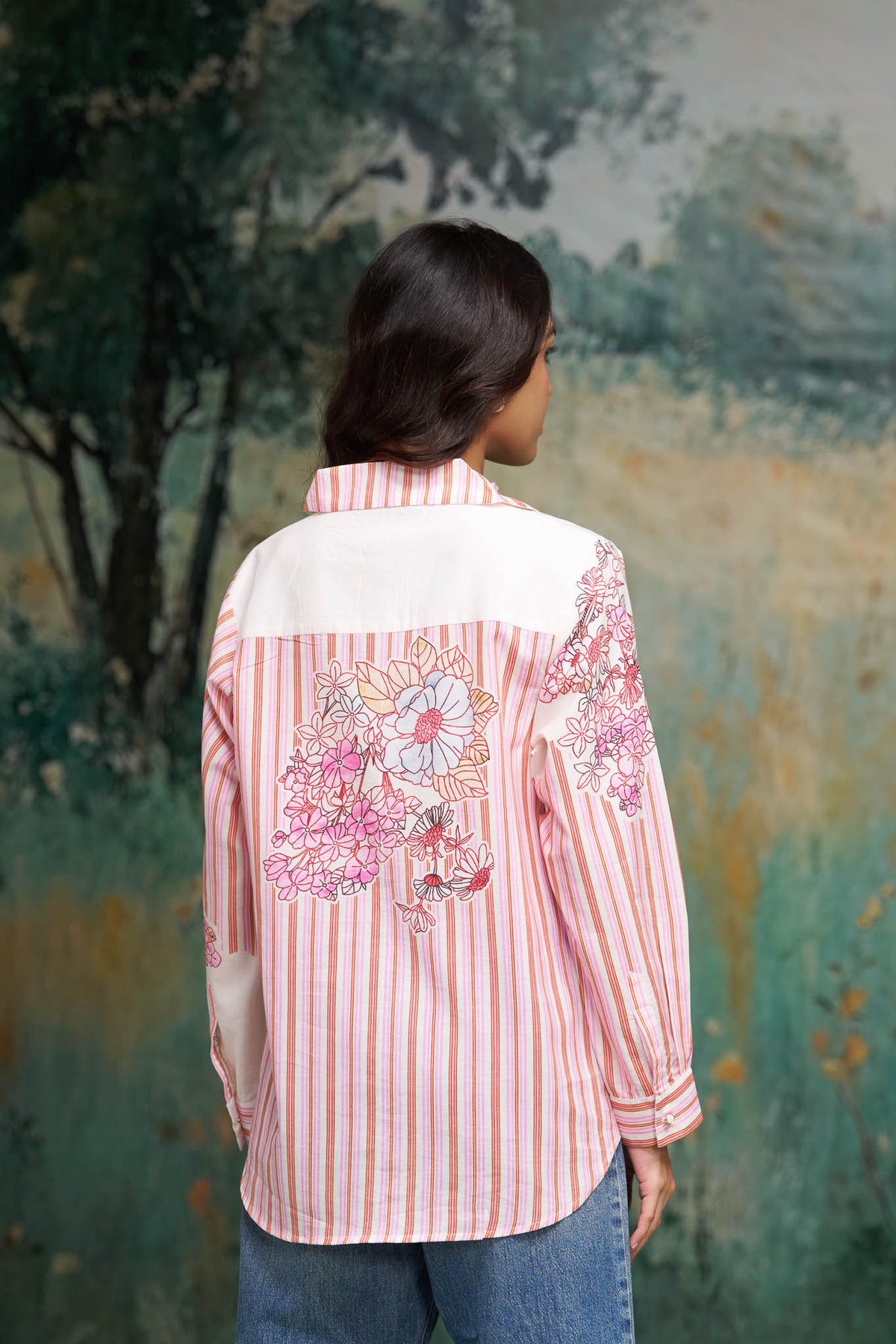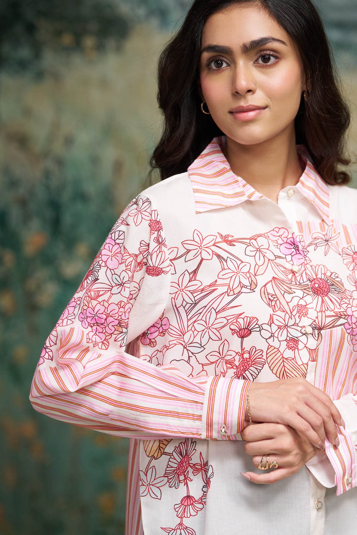 A charming pink cotton shirt with a horizontal half-and-half floral and stripe fusion — sweet and summery.
