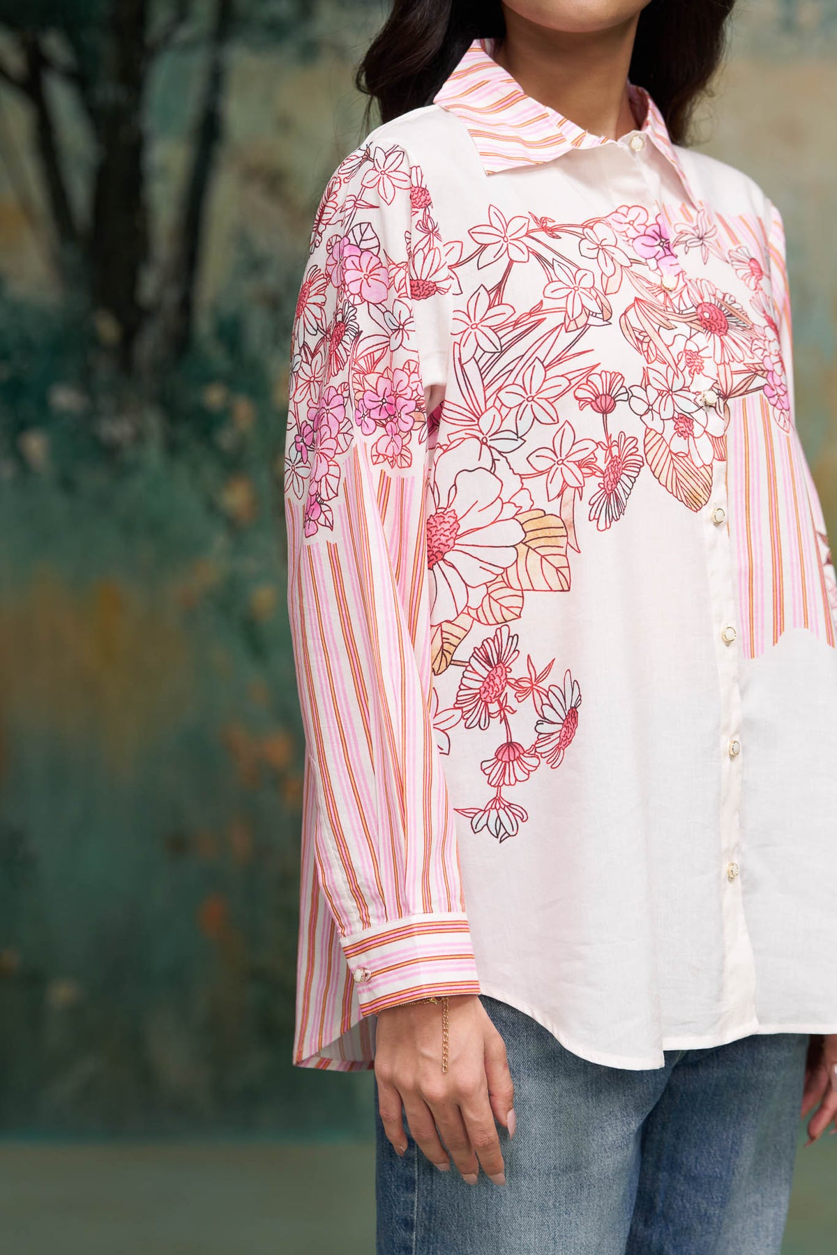 Top Details: Horizontal half & half pink floral and stripe fusion shirt