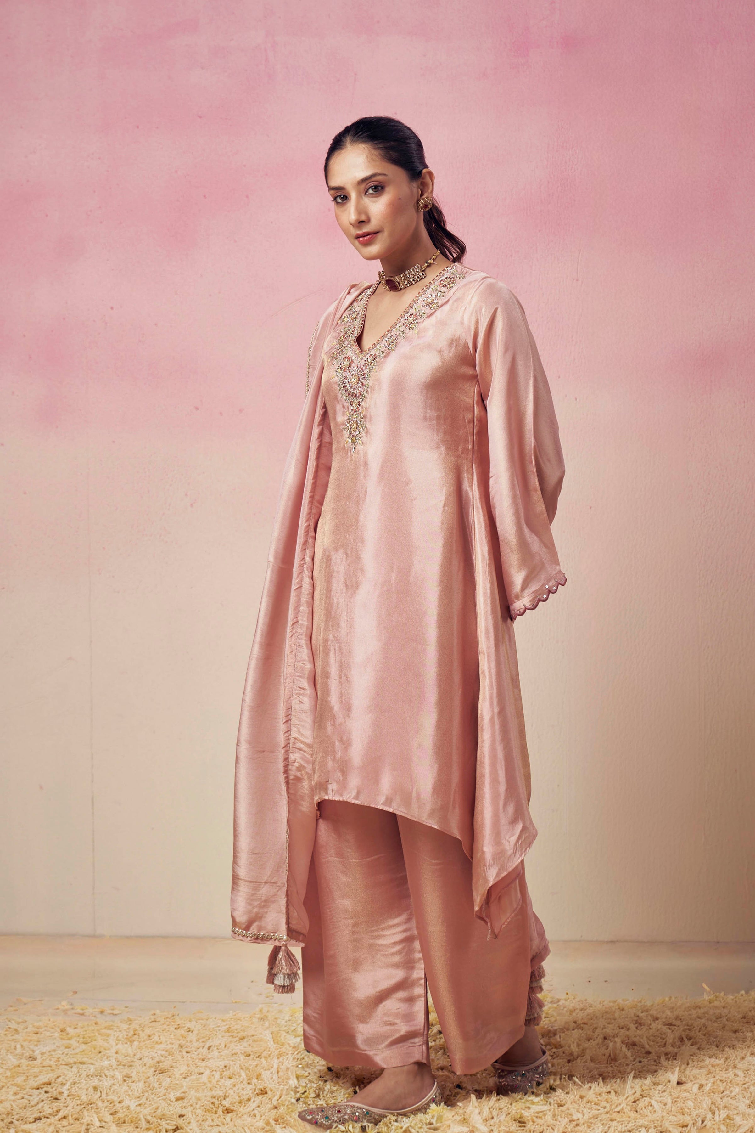 Embroidered neck work pattern suit set with Front Pleated Loose Pant