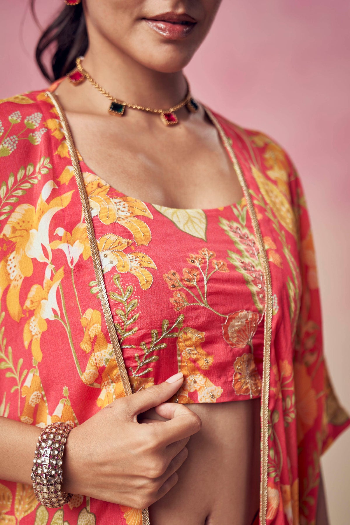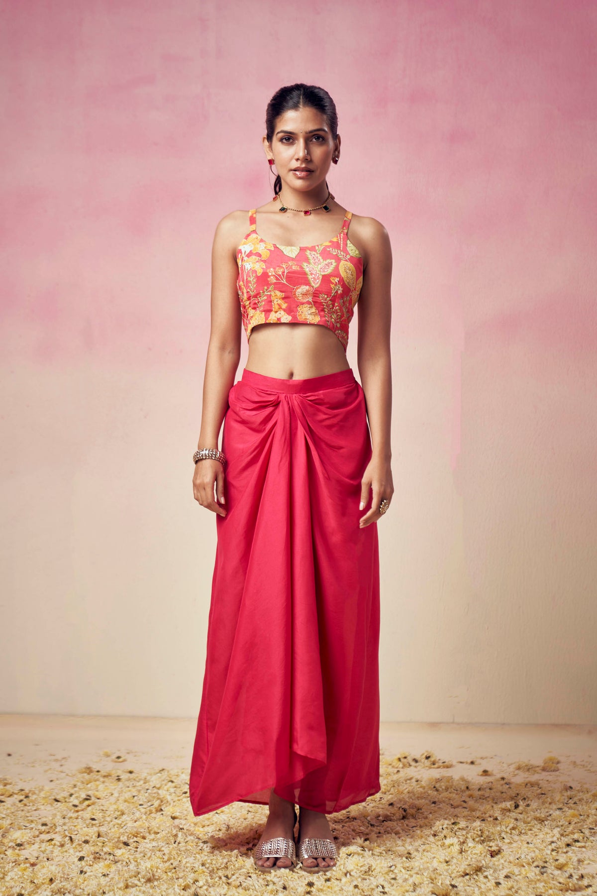 Pink Crop Top Skirt Set with Cape