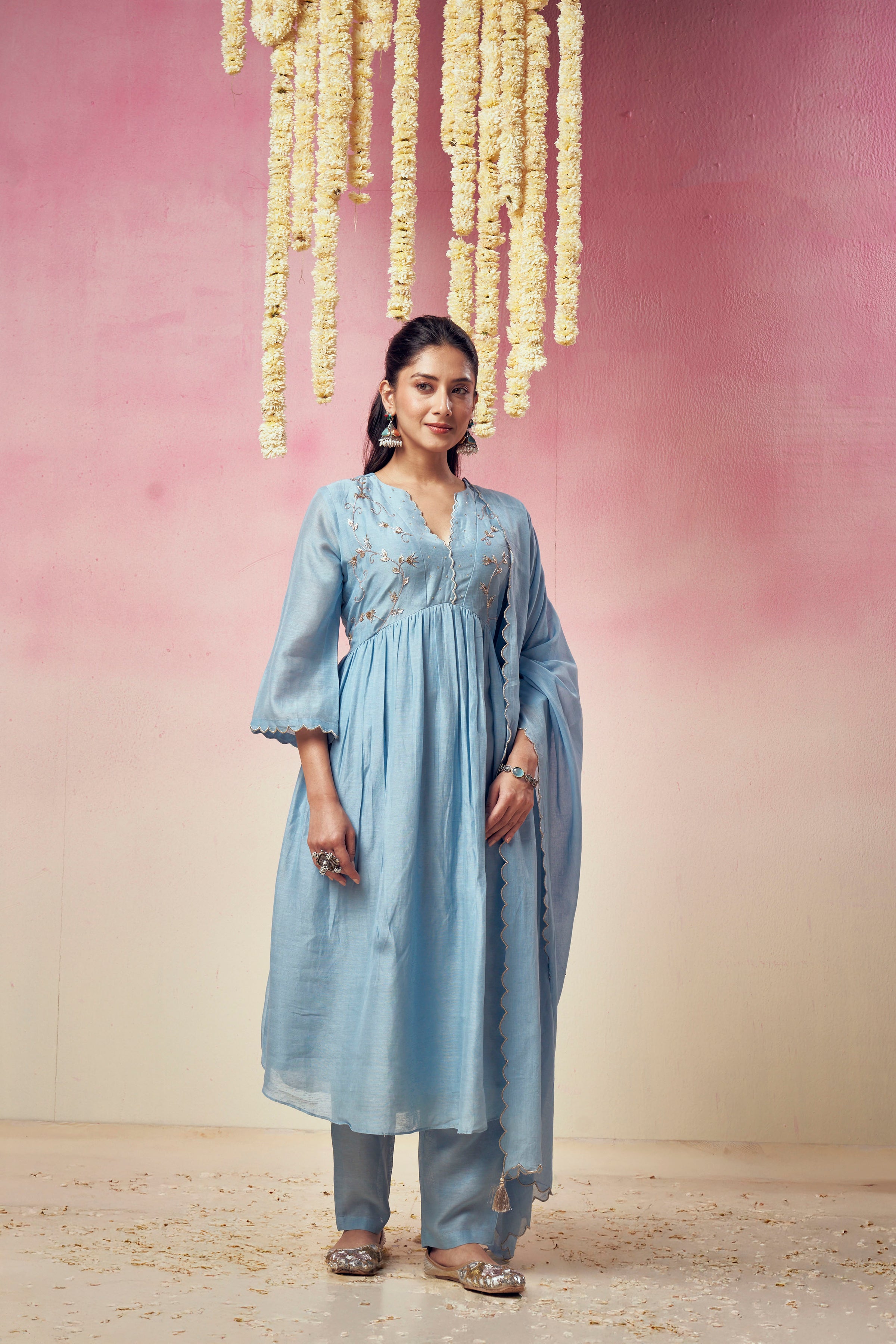 Scallope slit cut hand embroidered yoke with gathered pattern suit set and Straight Fit Pant