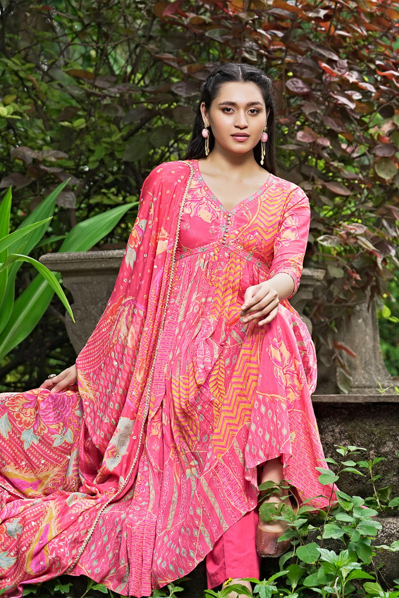 Lotus Pink Chinon Chiffon Kurta Set with Long Sleeves
