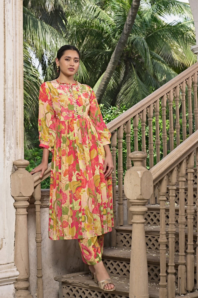 Printed Kurta Set with Ruffle Collar and Hand Work