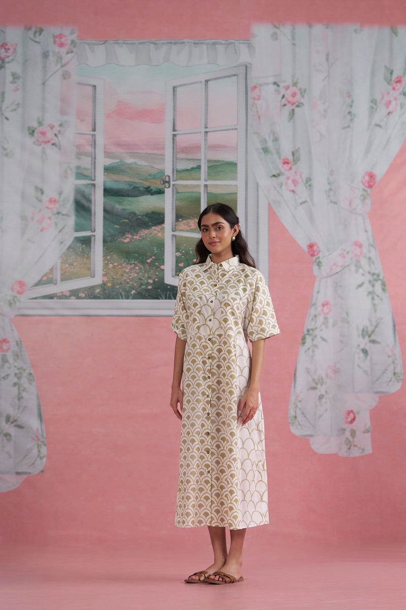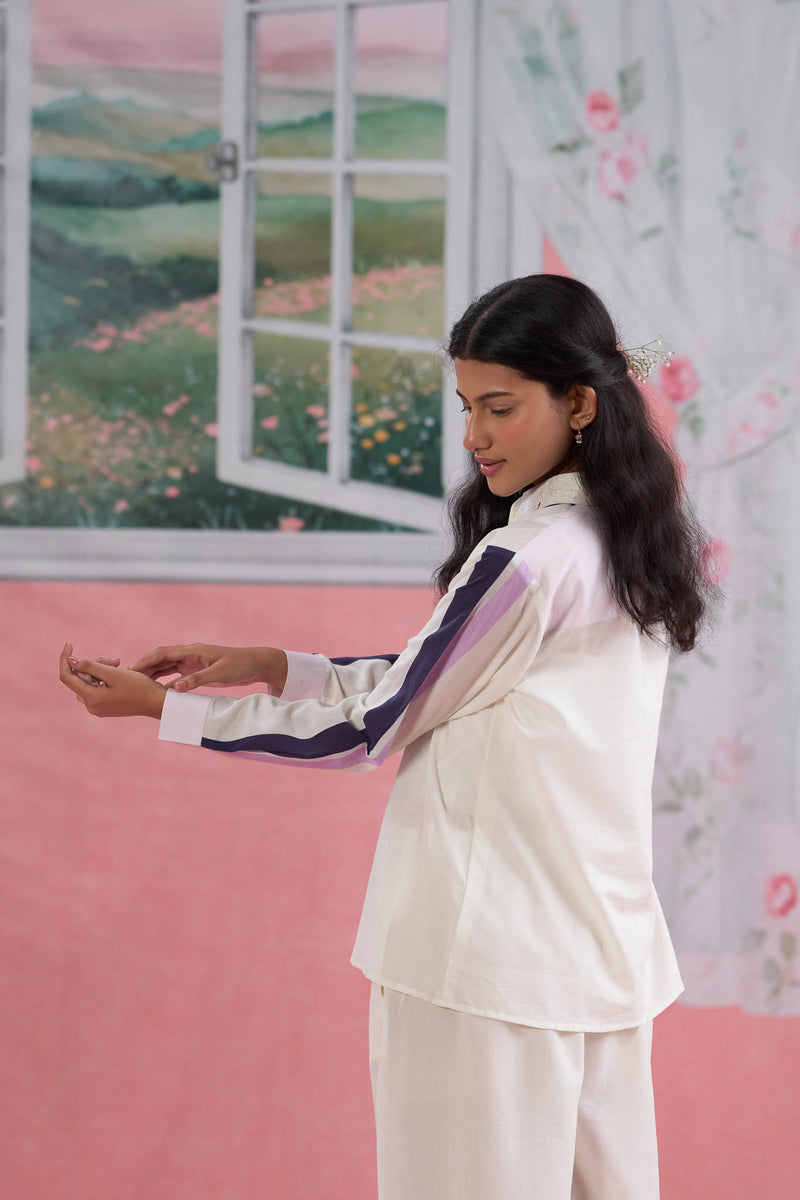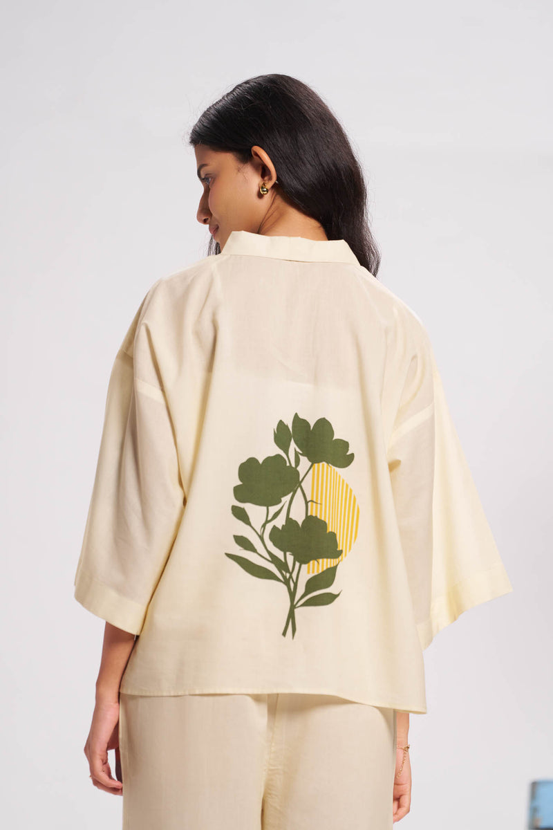 Ivory Floral Cotton Shirt with Striped Panel & Collared Neck