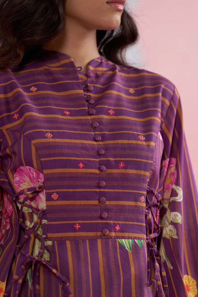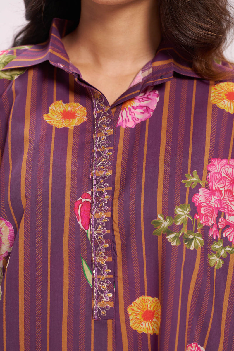 Purple Cotton Embroidered Placket Short Kurti Co-ord Set