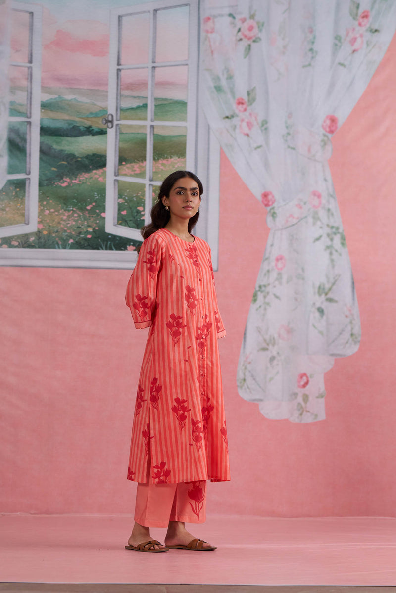 Blush Pink Floral Cotton Shirt with Striped Panel & Collared Neck
