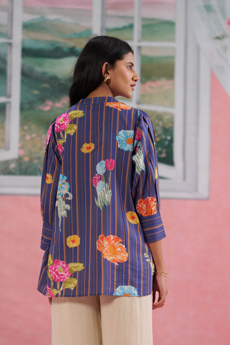Blue & White Cotton Shirt with Stripe and Floral Panel Design