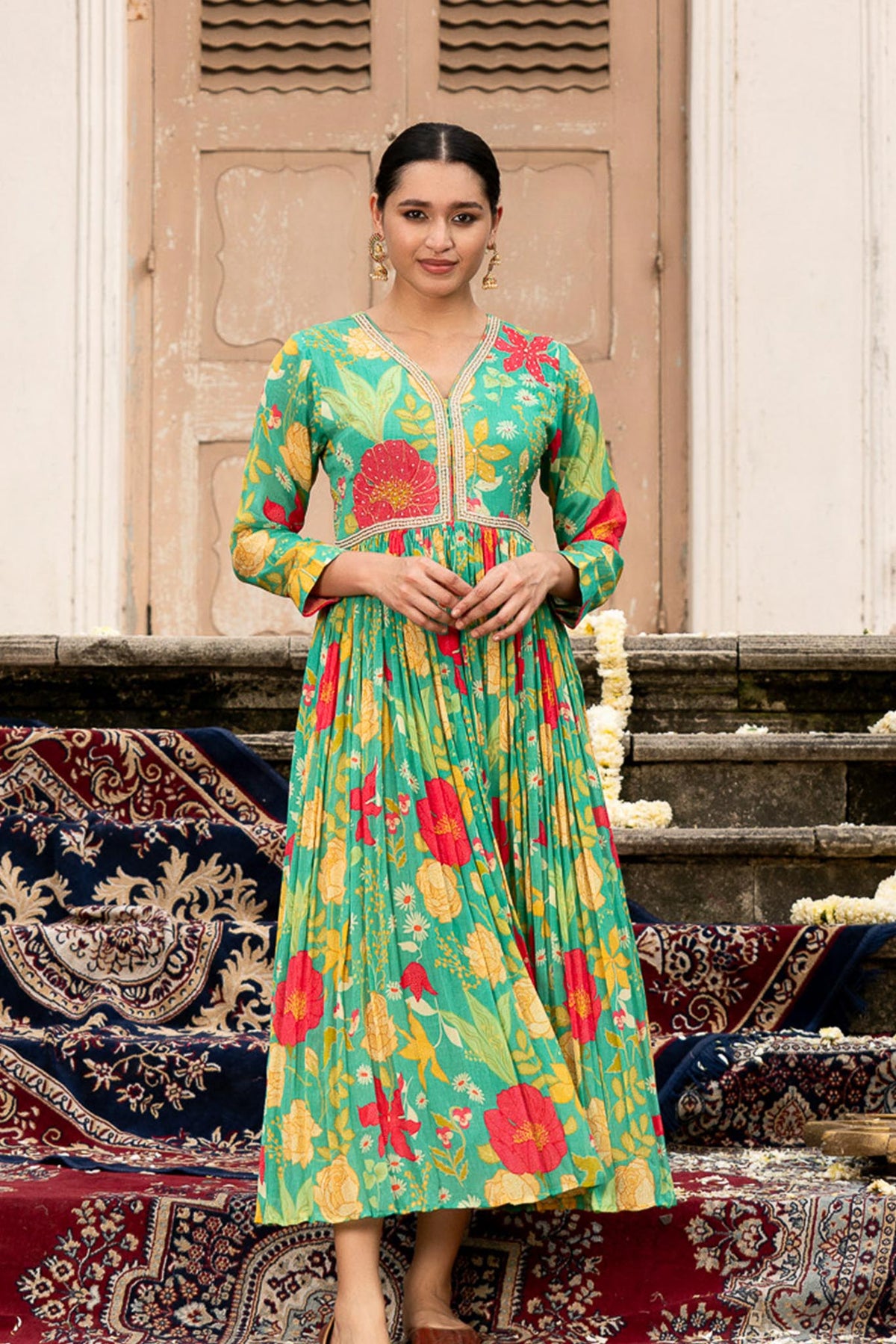 The Green Chiffon Gown is a testament to minimalist opulence. The calf-length dress, characterized by cord piping details at the neckline and waist-gathering, offers a canvas of timeless elegance, evoking an air of understated luxury.