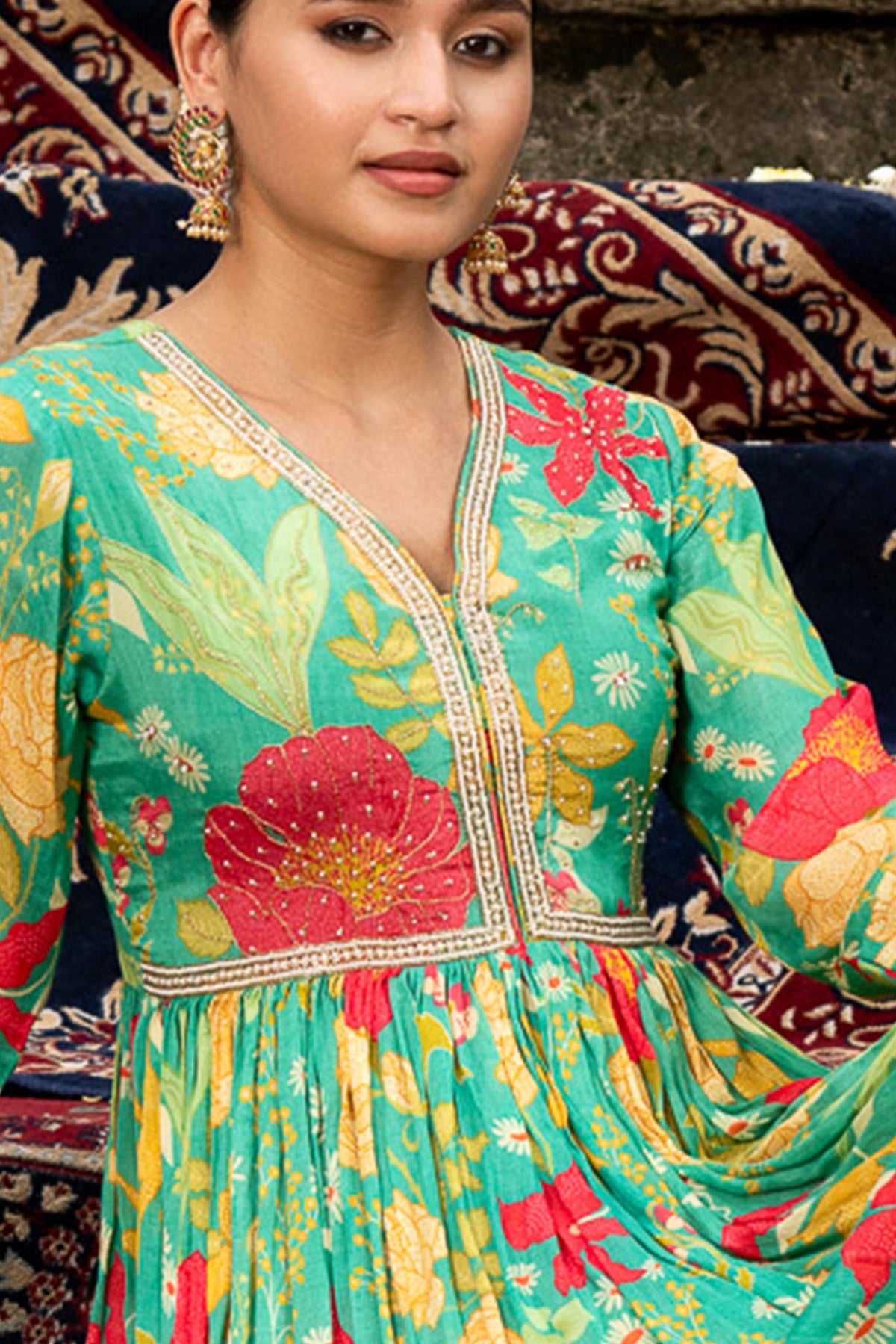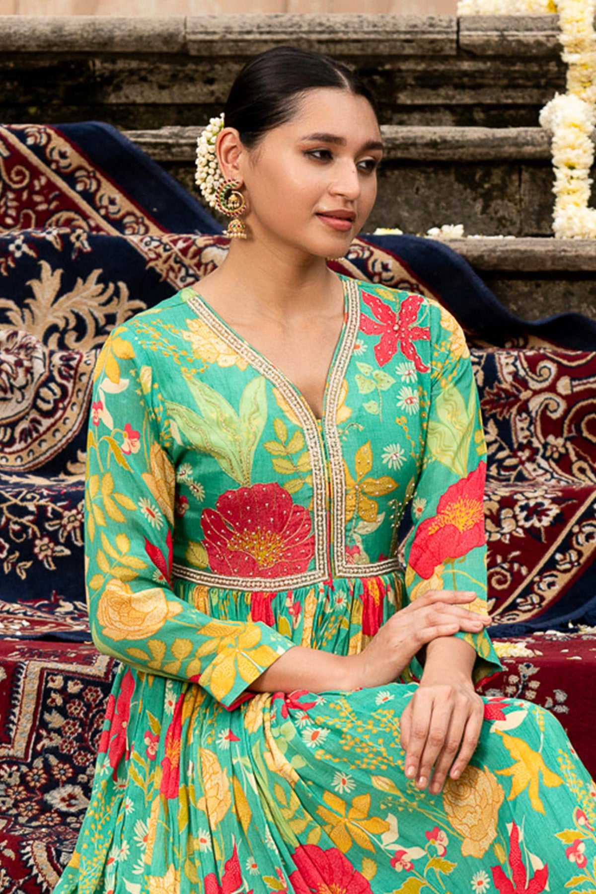 Green Chiffon Gown with Purl Embroidery in Yoke