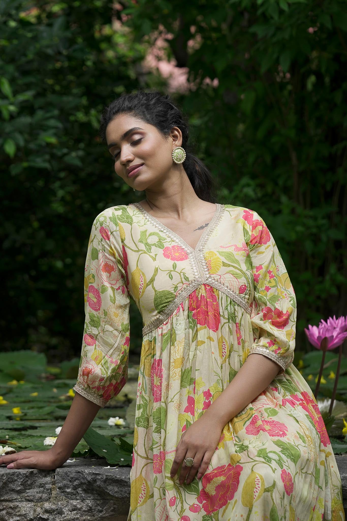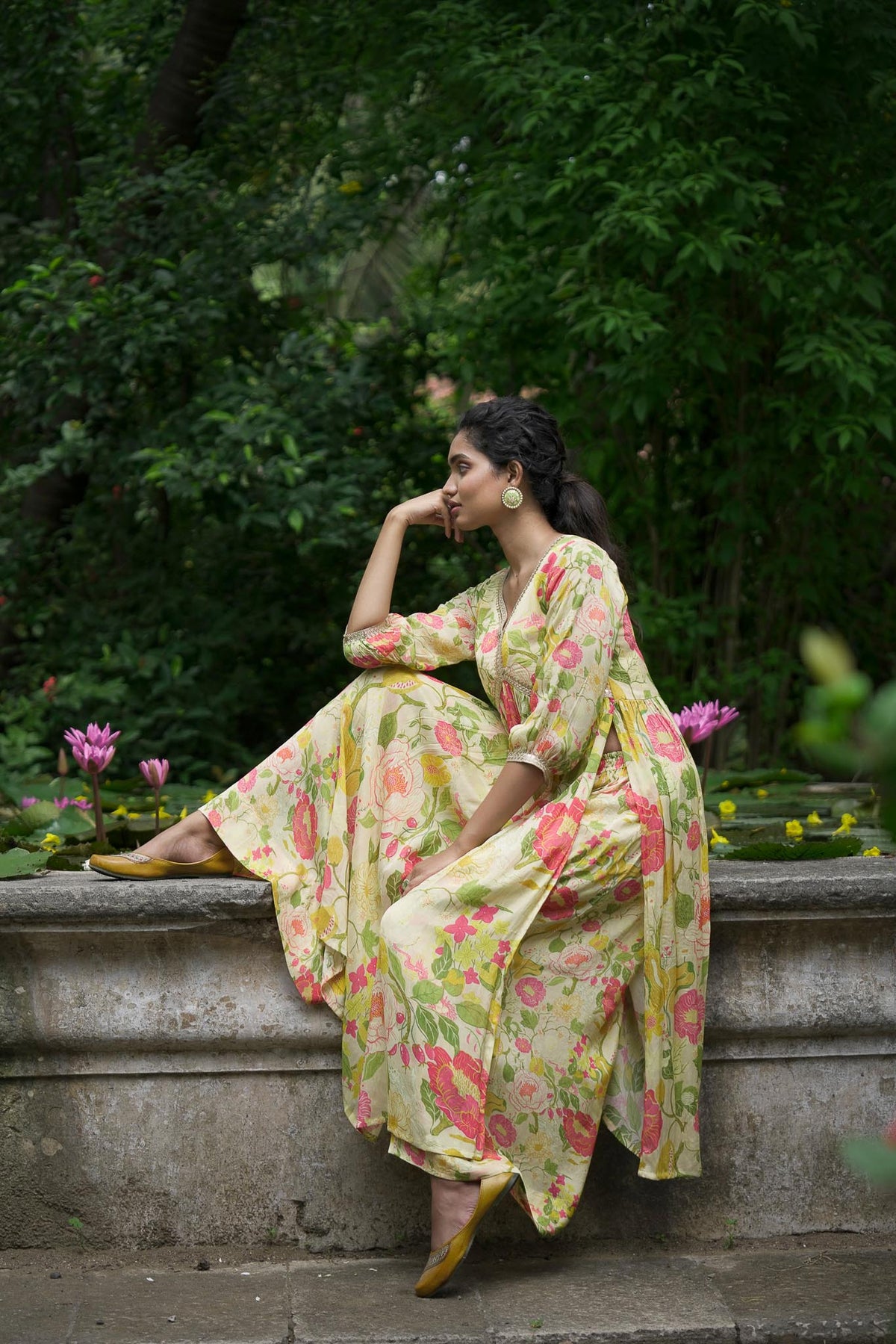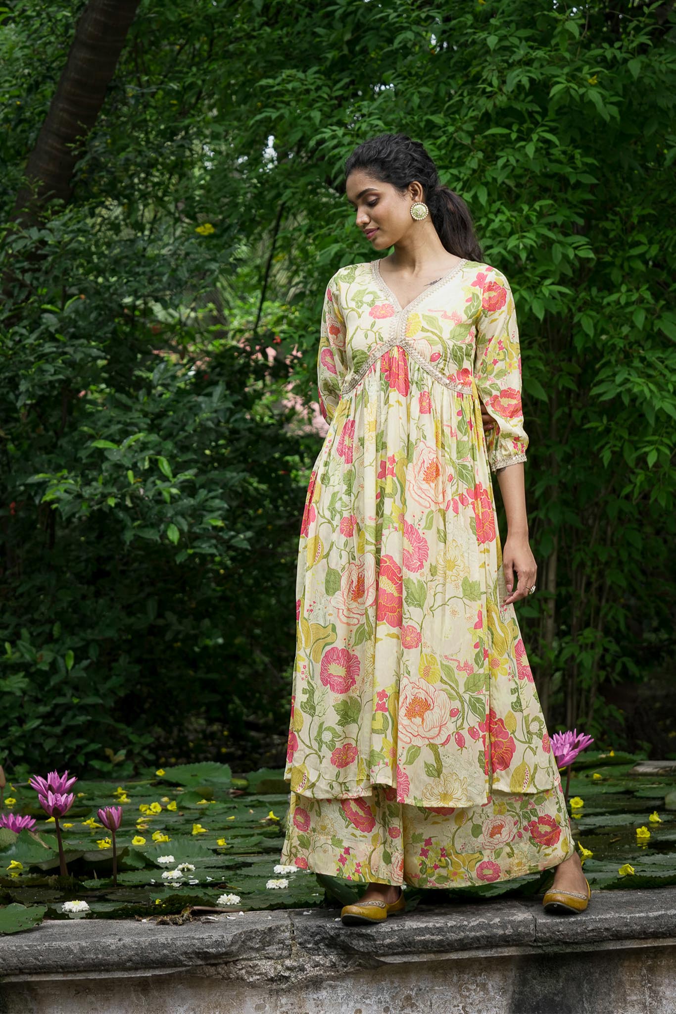 The printed palazzo are a delightful accompaniment. Sequined zari borders adorn the neckline and yoke, weaving an intricate tale of grace and opulence, ensuring that you make a lasting impression.