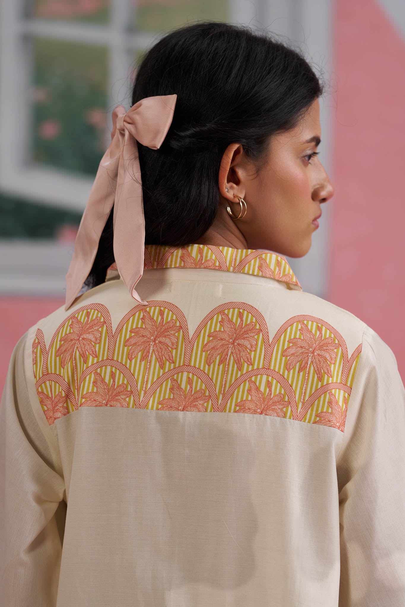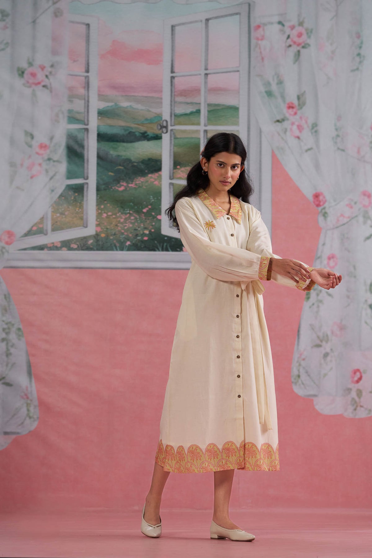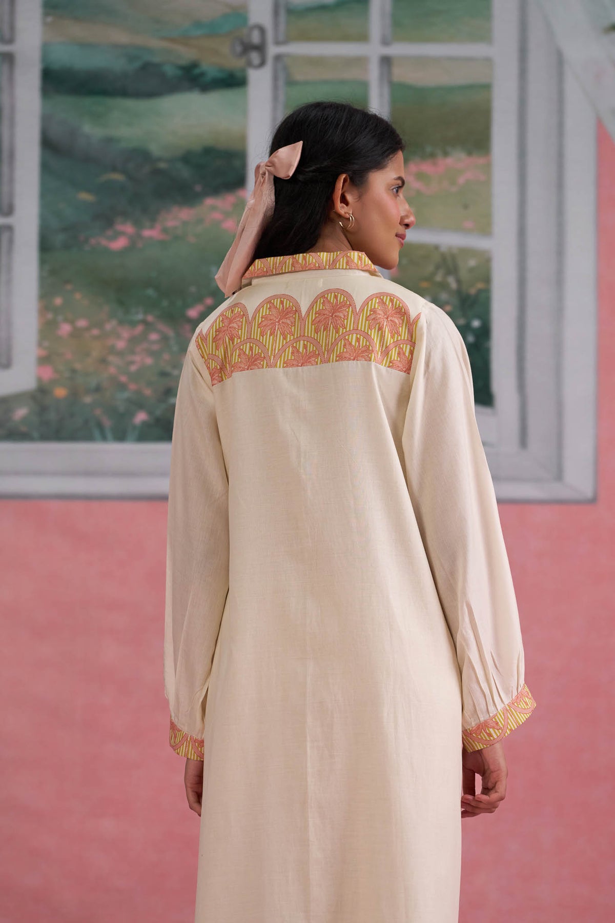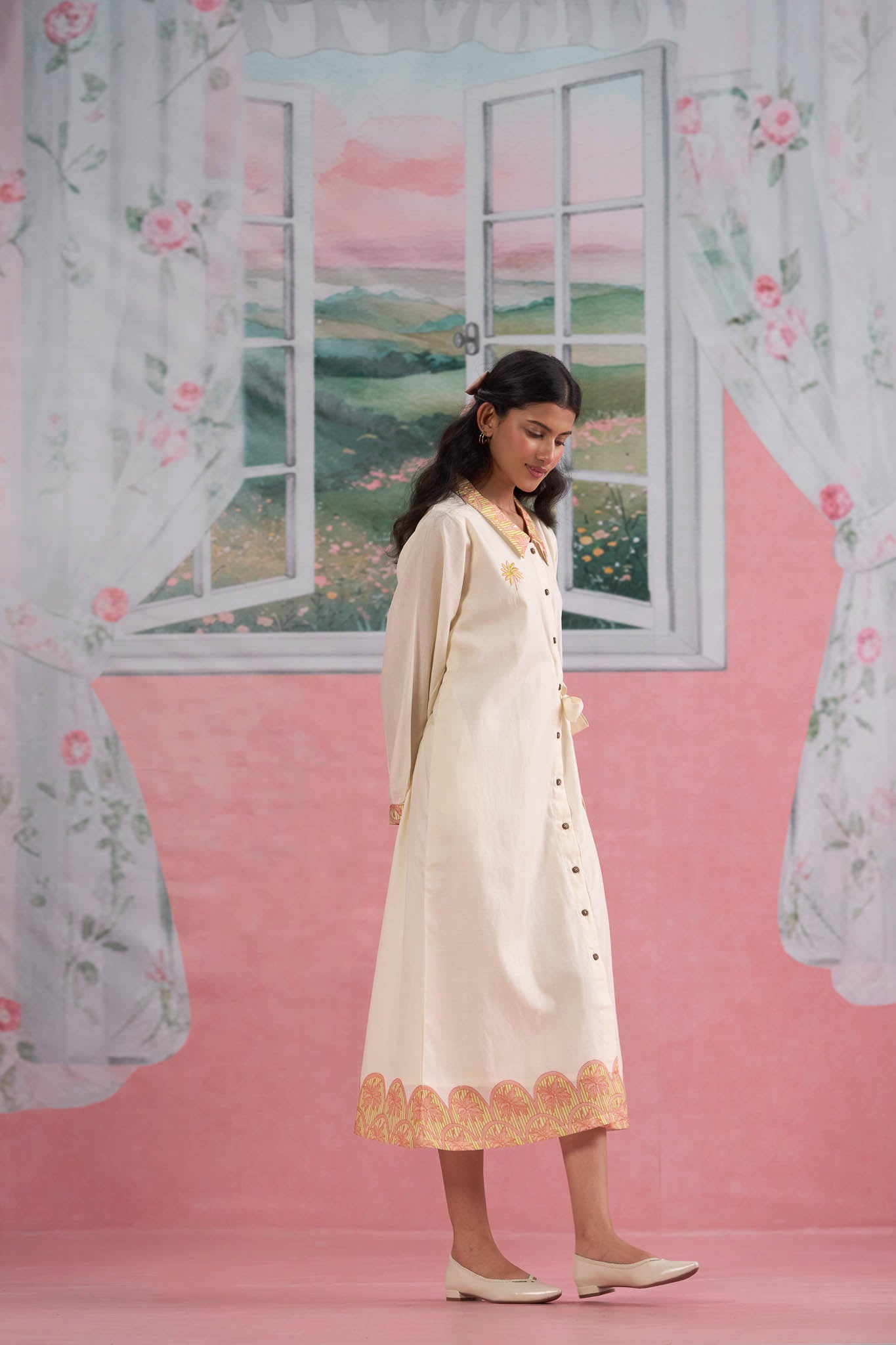 Ivory Cotton Shirt Dress with Printed Border
