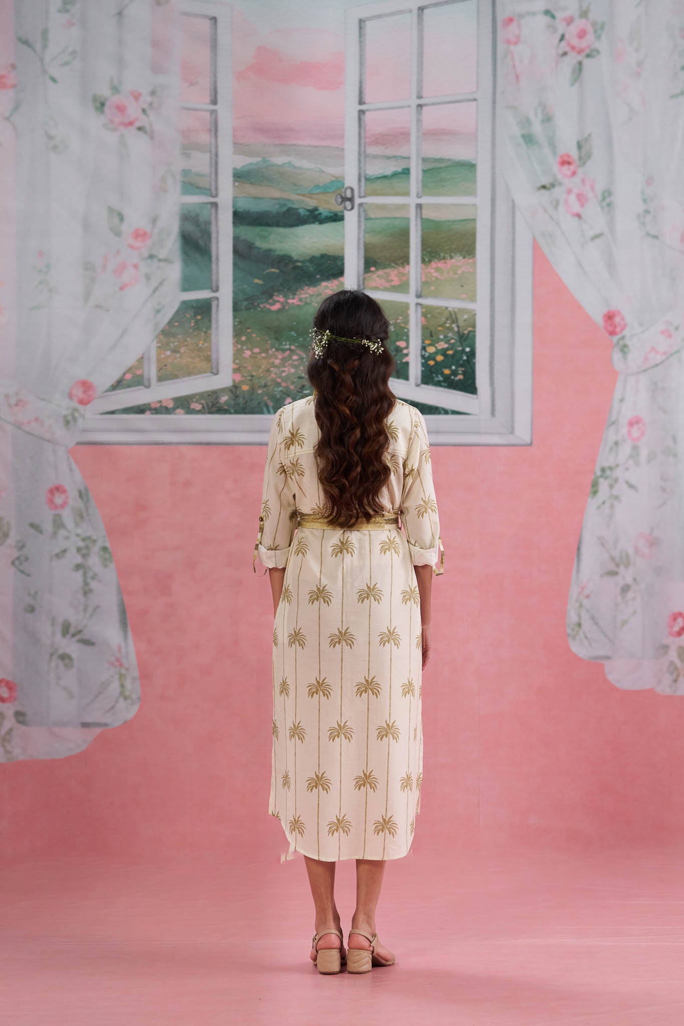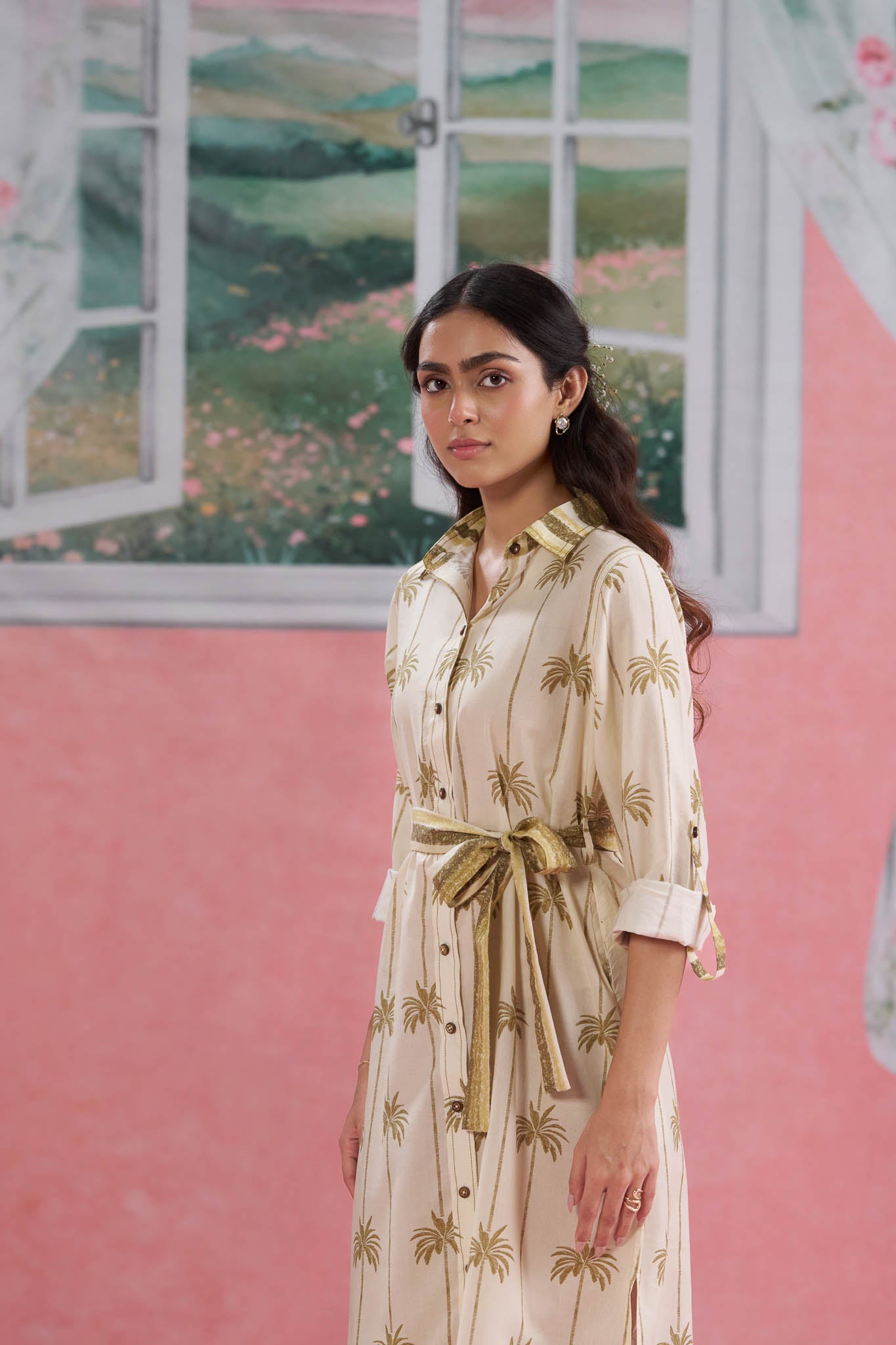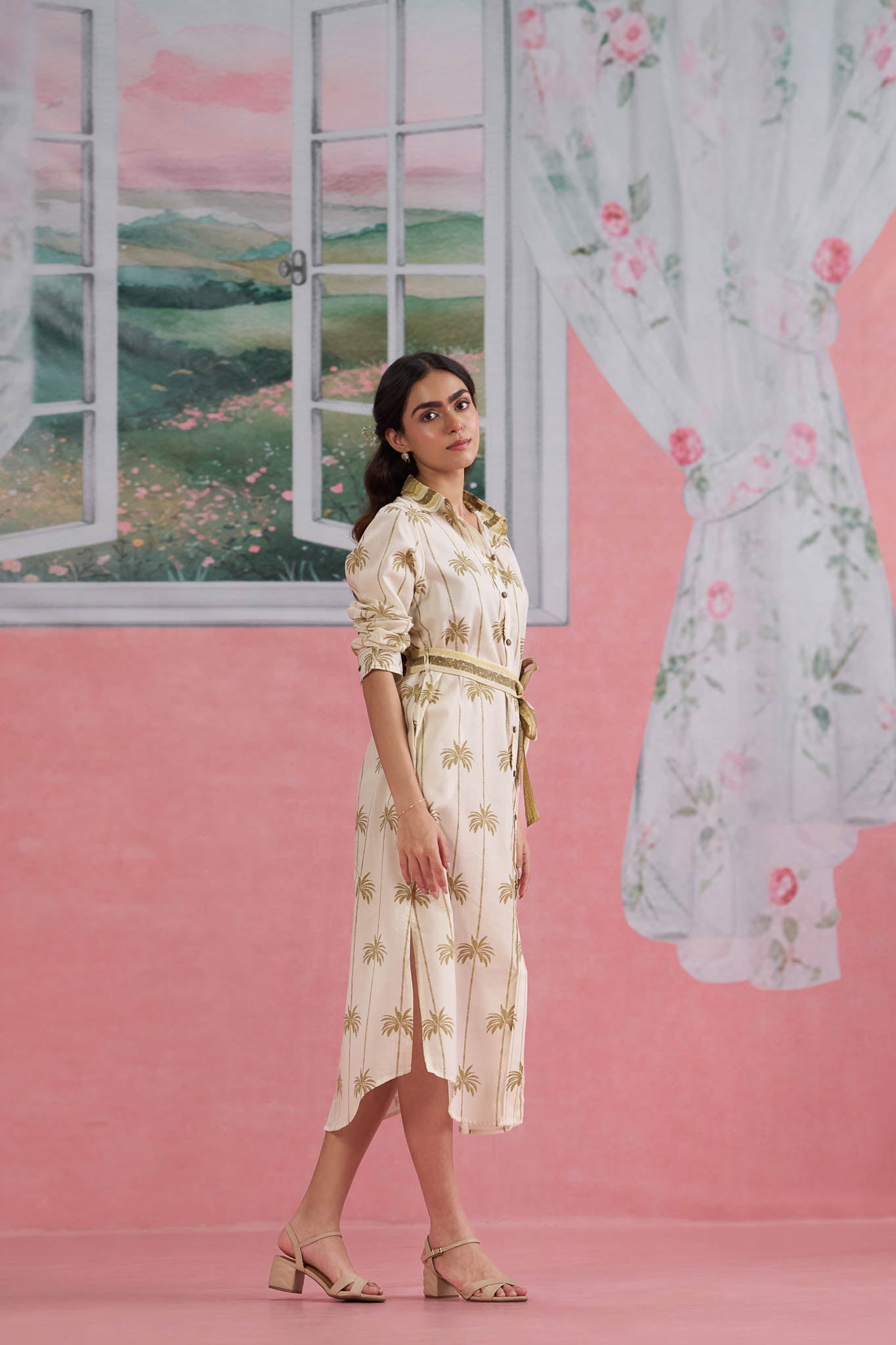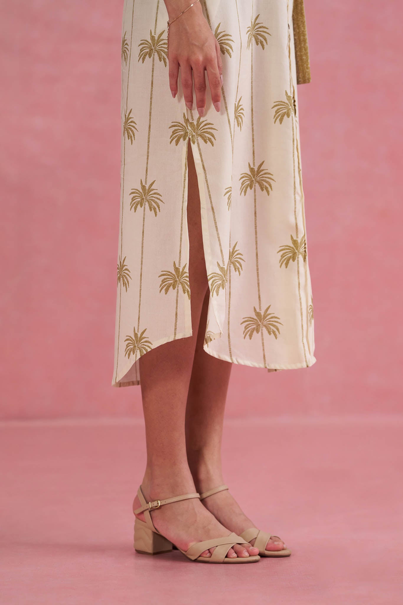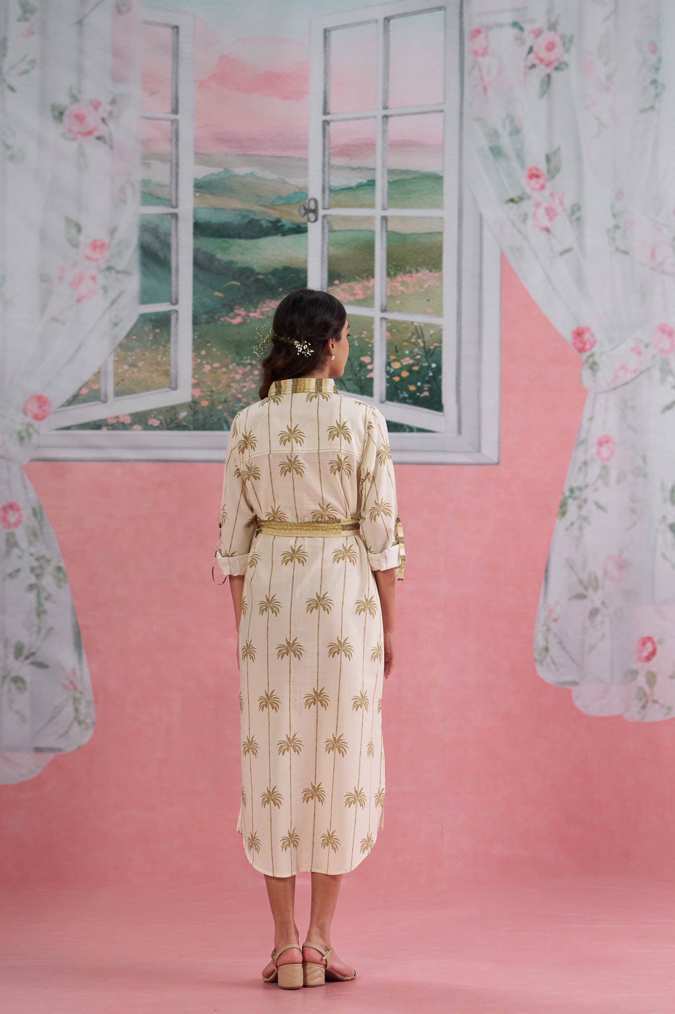A classic beige cotton shirt dress with a charming coconut print — breezy, tropical and perfect for summer days.