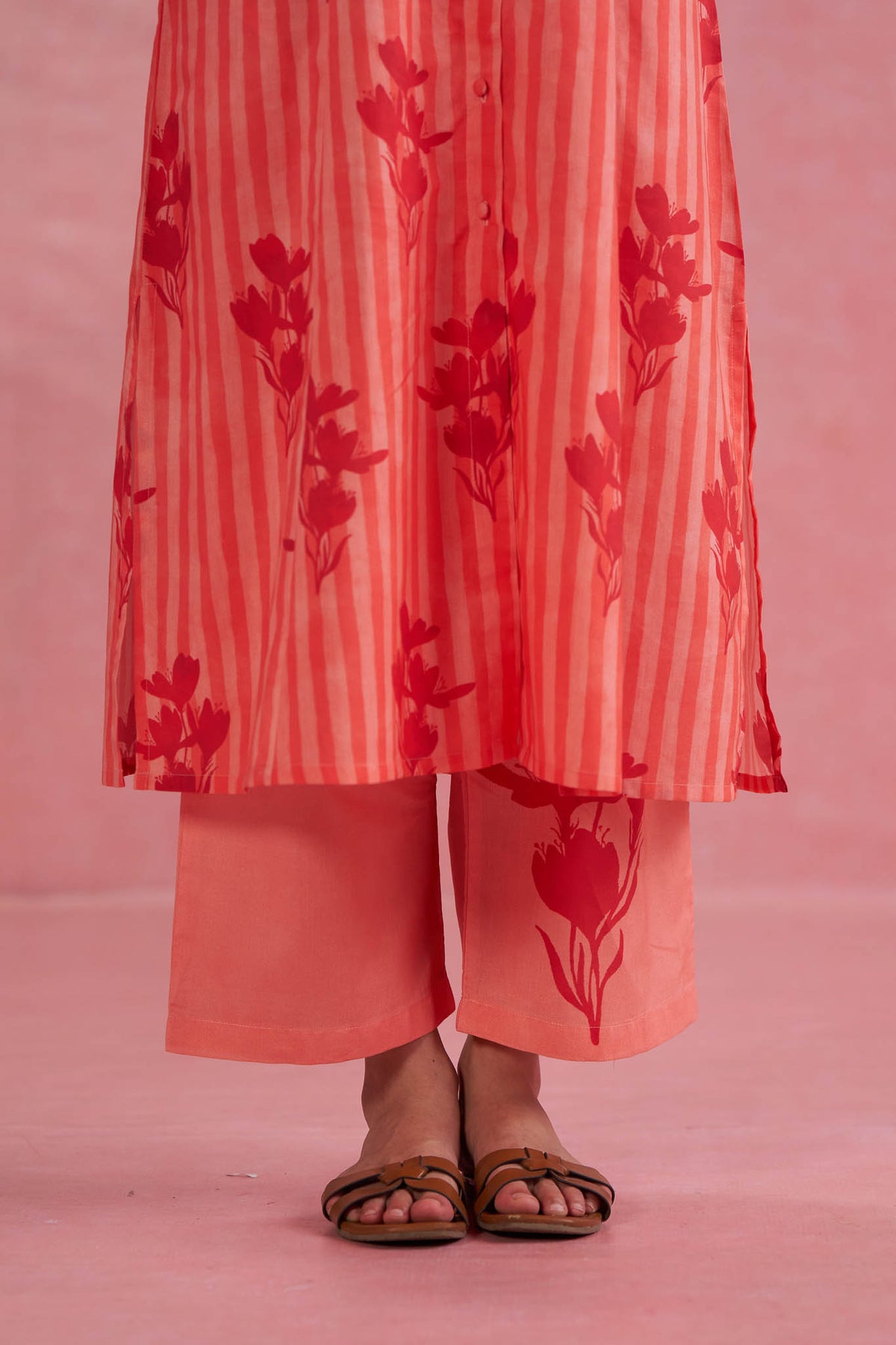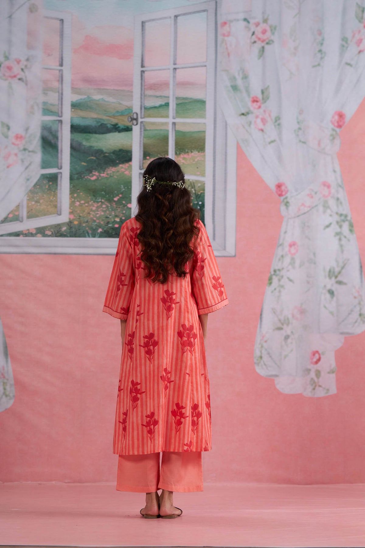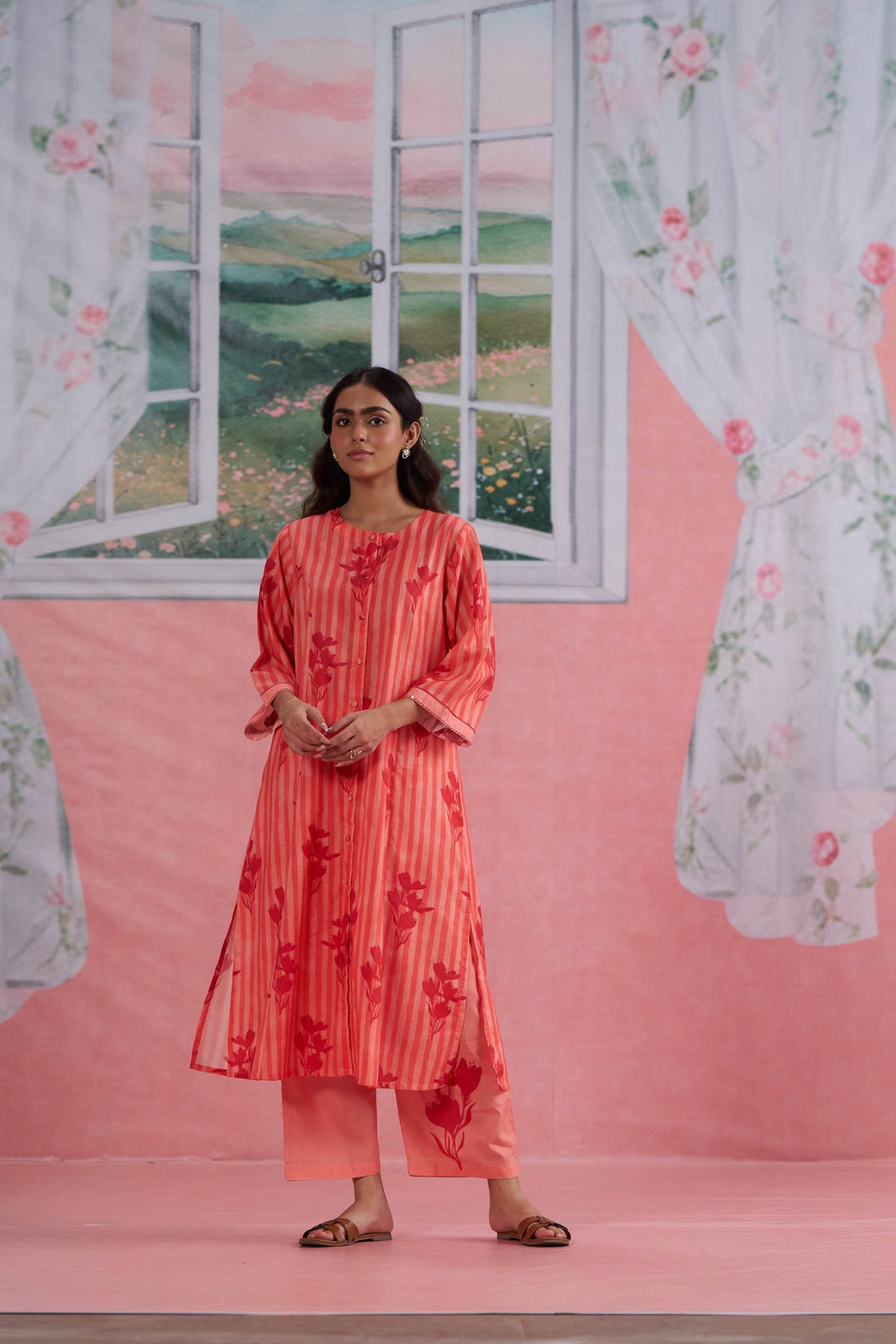 A flattering princess cut cotton kurti with armhole detailing and placement print pants for a feminine summer look.