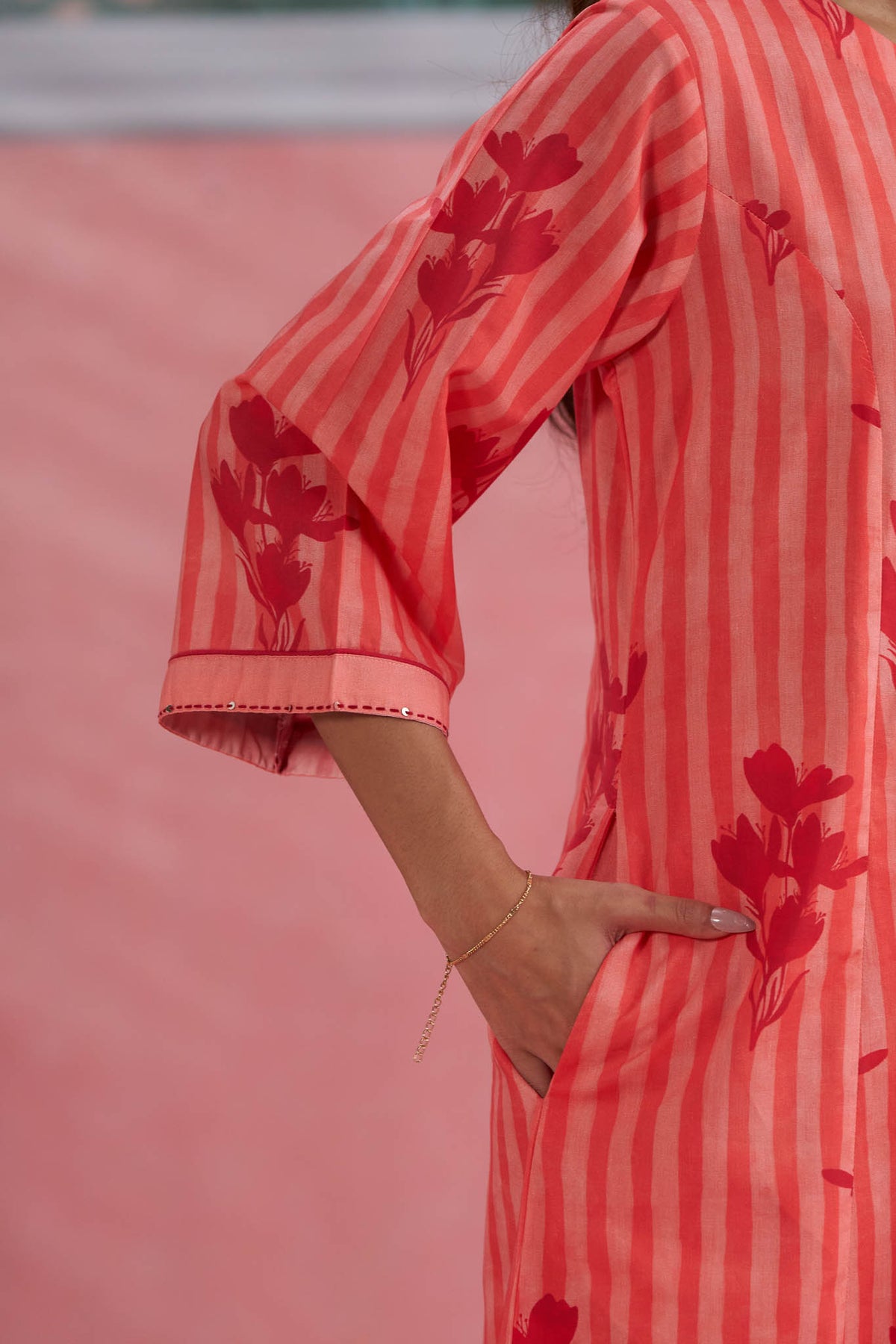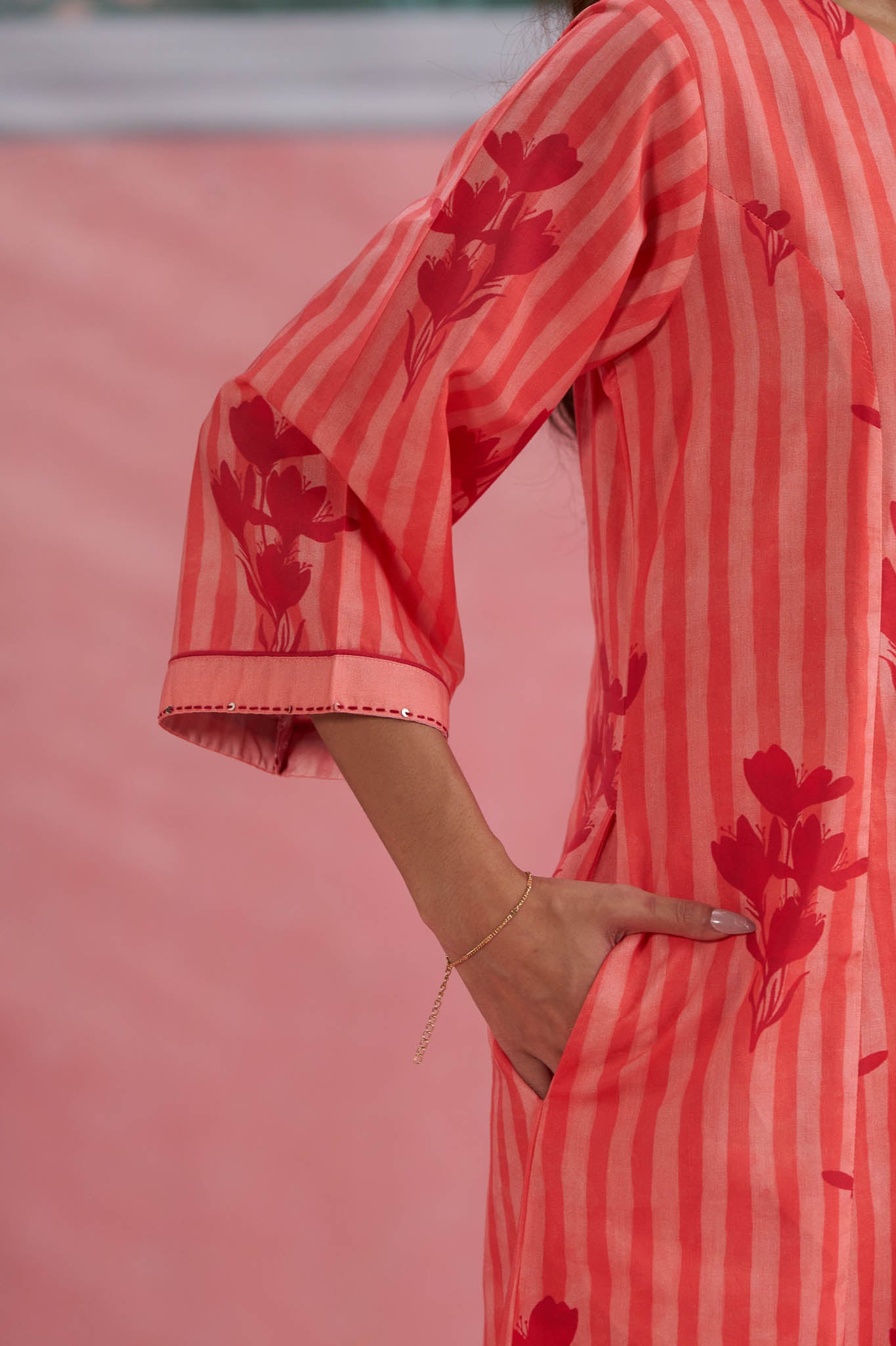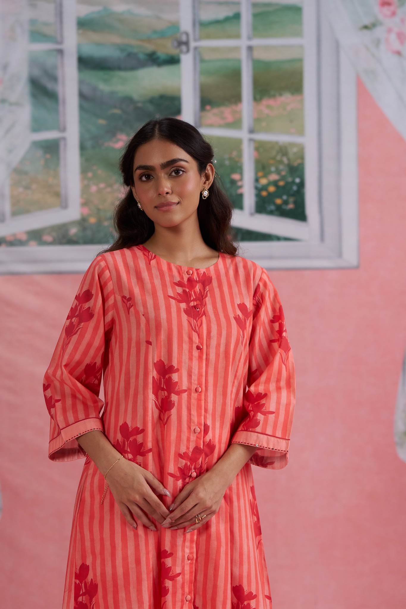 A flattering princess cut cotton kurti with armhole detailing and placement print pants for a feminine summer look.